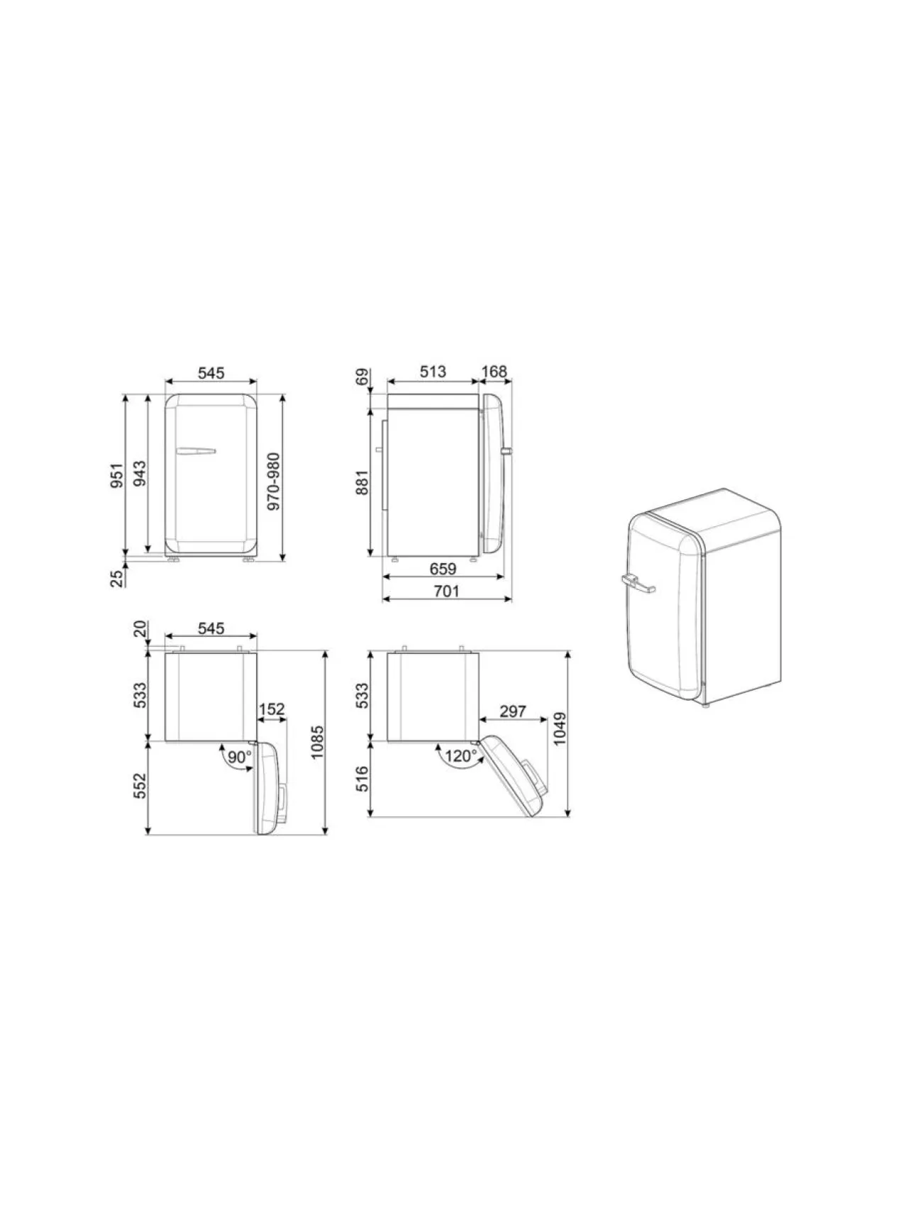 Tuotteen syvyys kun ovi auki 90°: 1085 mm