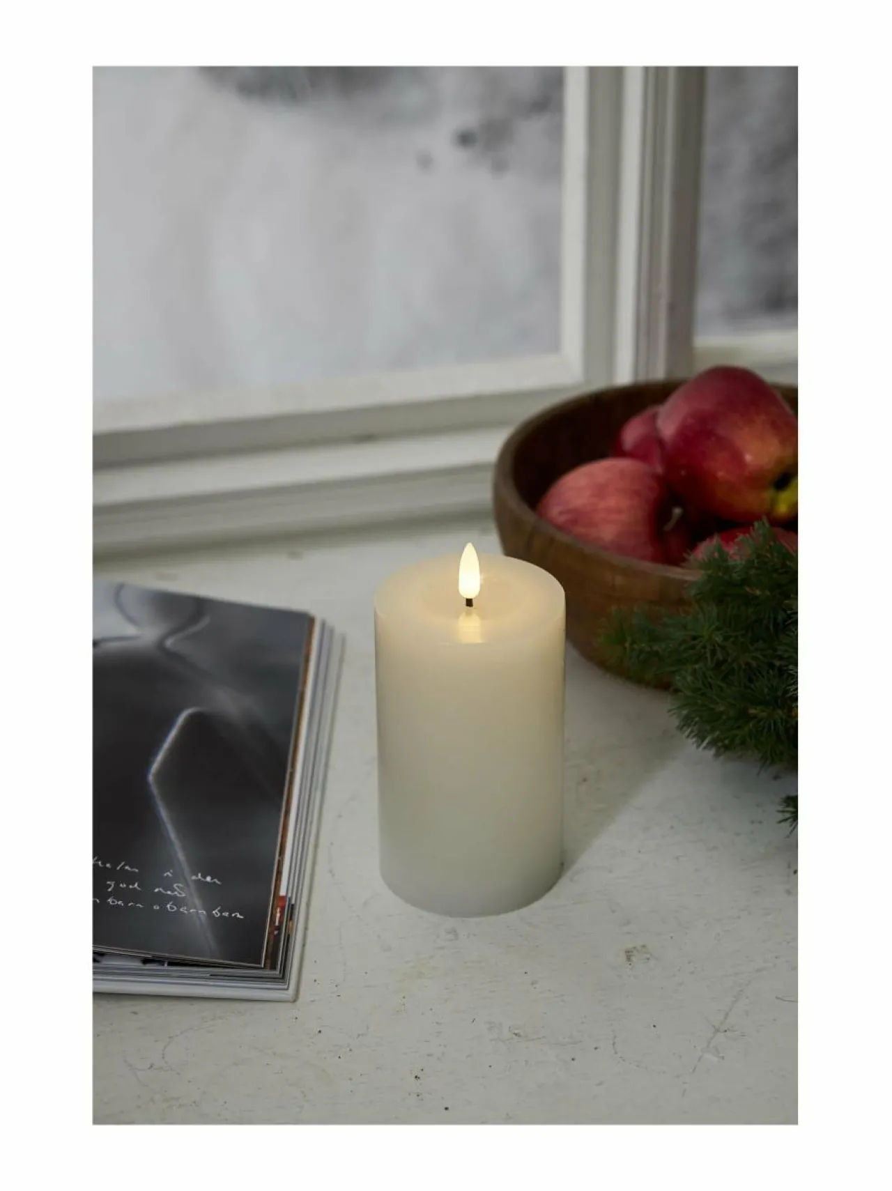 Vahakynttilä, jonka aitoa muistuttava LED-liekki ja kiiltävä, sulalta steariinilta näyttävä syvennys liekin alapuolella saavat sen näyttämään oikealta palavalta kynttilältä. Valon sävy on lämmin valkoinen. Ajastintoiminnon avulla kynttilä palaa 6 tunnin ajan kerrallaan ja syttyy seuraavana päivänä samaan aikaan uudelleen. Kynttilä toimii kahdella AA-paristolla, jotka eivät sisälly pakkaukseen. Ajastintoimintoa käytettäessä paristokesto on noin 250 päivää. Halkaisija 7,5 cm ja korkeus 15 cm. Kiinteä LED, lamppua ei voi vaihtaa. Sisäkäyttöön IP20.