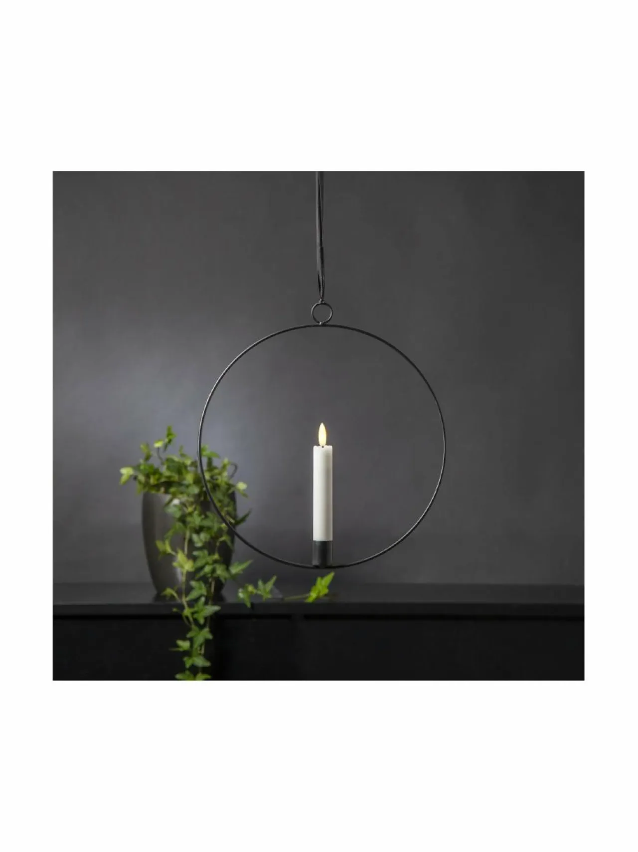 Flamme on tyylikäs, musta metallirengas, jonka voi ripustaa esimerkiksi ikkunaan tai seinälle tunnelmanluojaksi. Renkaan keskellä on lämpimän valkoista valoa hohtava kaunis LED-kynttilä. Renkaan korkeus on 30 cm, leveys 28,5 cm ja syvyys 2,5 cm. Kynttilä on 15 cm korkea, ja toimii yhdellä AA-paristolla. Paristo ei sisälly pakkaukseen. Kynttilässä on ajastintoiminto, joka sammuttaa kynttilän 6 tunnin kuluttua ja sytyttää sen taas 18 tunnin päästä uudelleen. LED-valon paloaika on n. 10 000 tuntia.