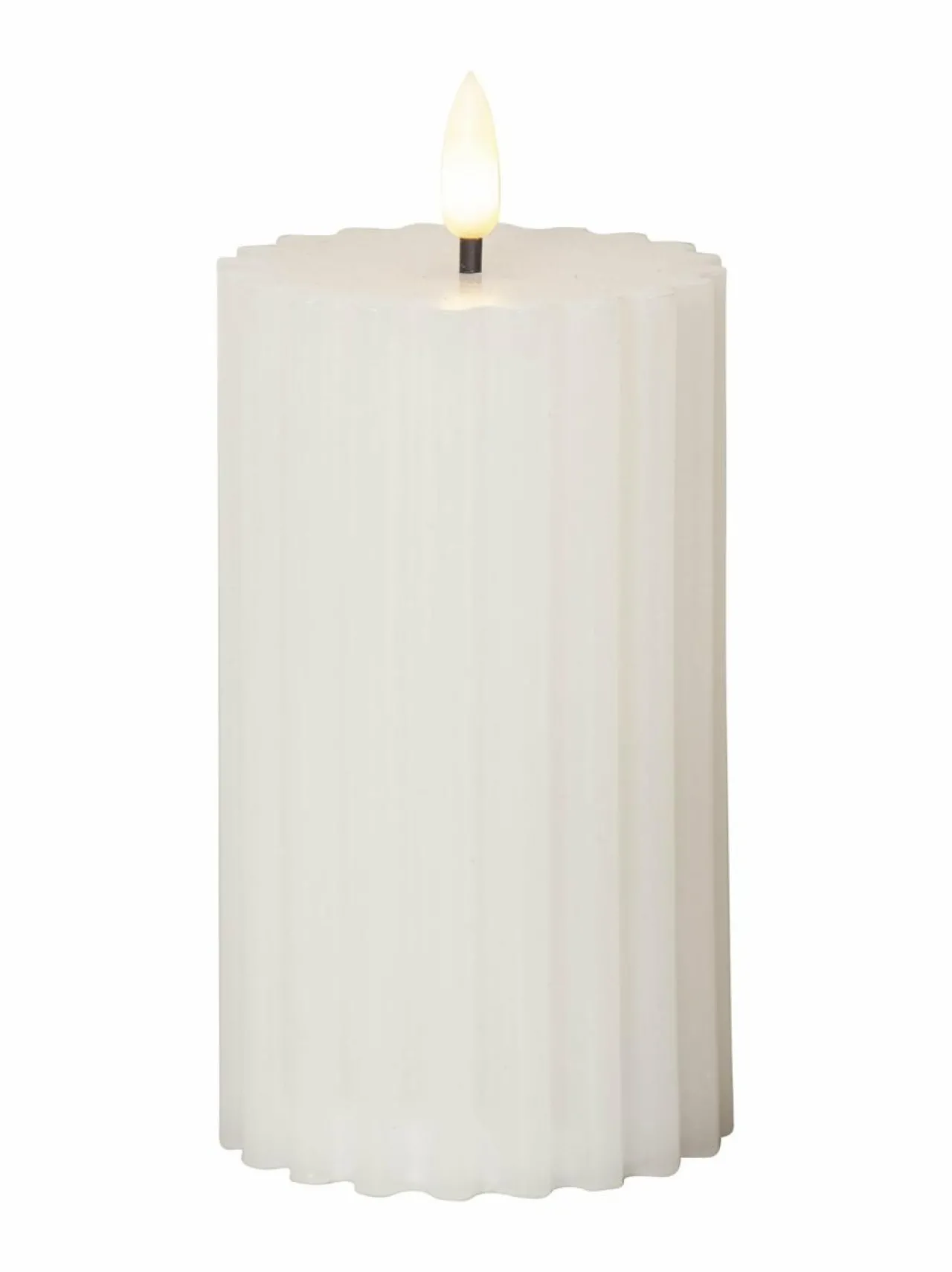 Vahasta valmistettu LED-kynttilä sisäkäyttöön. Kynttilässä on uritettu pinta ja kaunis luonnollisen näköinen liekki lämpimän valkoisella valolla.