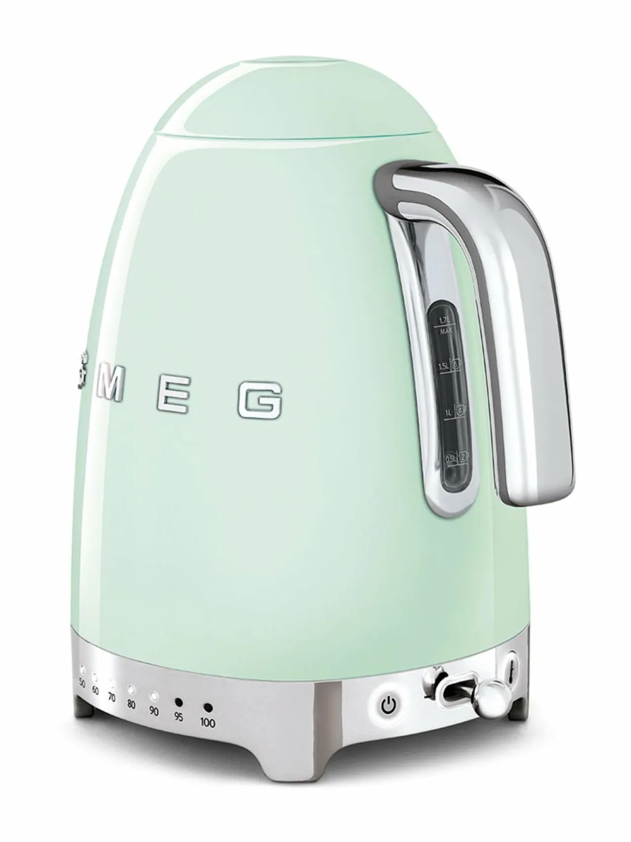 Smegin KLF04PGEU-vedenkeittimessä on seitsemän eri lämpötila-asetusta 50 °C ja 100 °C välillä, joten voit lämmittää lempiteelaadullesi parhaiten sopivaa vettä. Tehokas 2400 W vedenkeitin kiehauttaa nopeasti jopa 1,7 litraa vettä kerrallaan. Keittimen kannuosa on mintunvihreäksi maalattua ruostumatonta terästä.