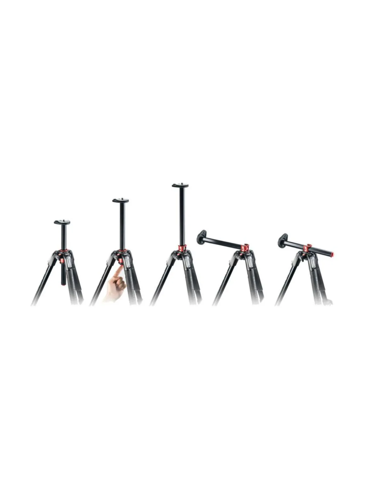 Mandrotto Pro kamerajalustojen tapaan tässä on Manfrotto 90-astetta poikittain kääntyvä keskiputki, joka on mainio suoraan-alas-kuvausta varten. Kun putken kääntää poikittain, ja jalkakulman säätää suurimmalleen, pienimmäksi työskentelykorkeudeksi saadaan noin 8 senttia. Tämä on erinomainen erimerkiksi makrokuvaukseen tai muuhun kuvaukseen läheltä maan pintaa.