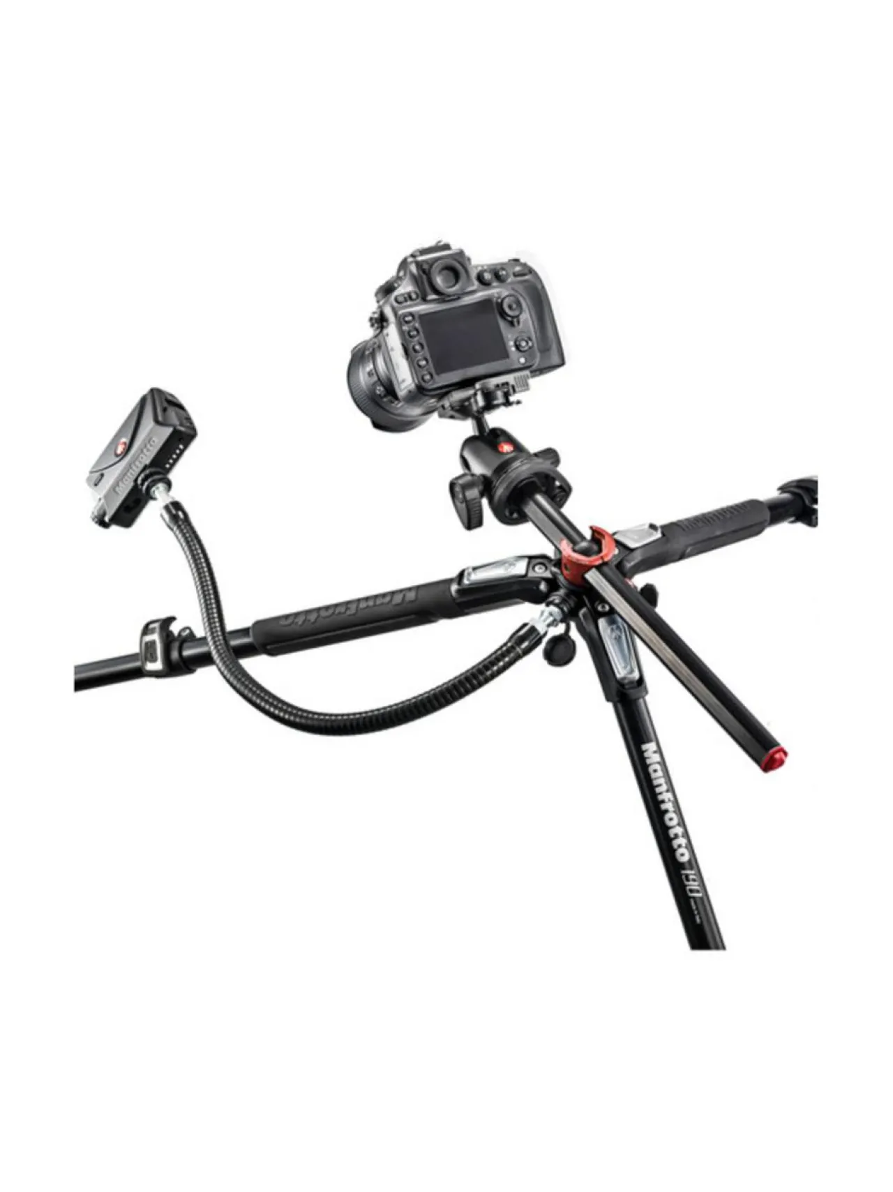 Manfrotto 190 XPro kolmijalan keskisillasta löytyy varusteliitäntä 3/8-tuuman kierteellä, josta Manfrotto käyttää nimitystä Easy Link. Erikseen ostettavan varustevarren (esim. Manfrotto 244 Micro tai Manfrotto 234 Flex Arm) avulla voit liittää jalustaan esimerkiksi LED-valon tai kuvausmonitorin tmv.
