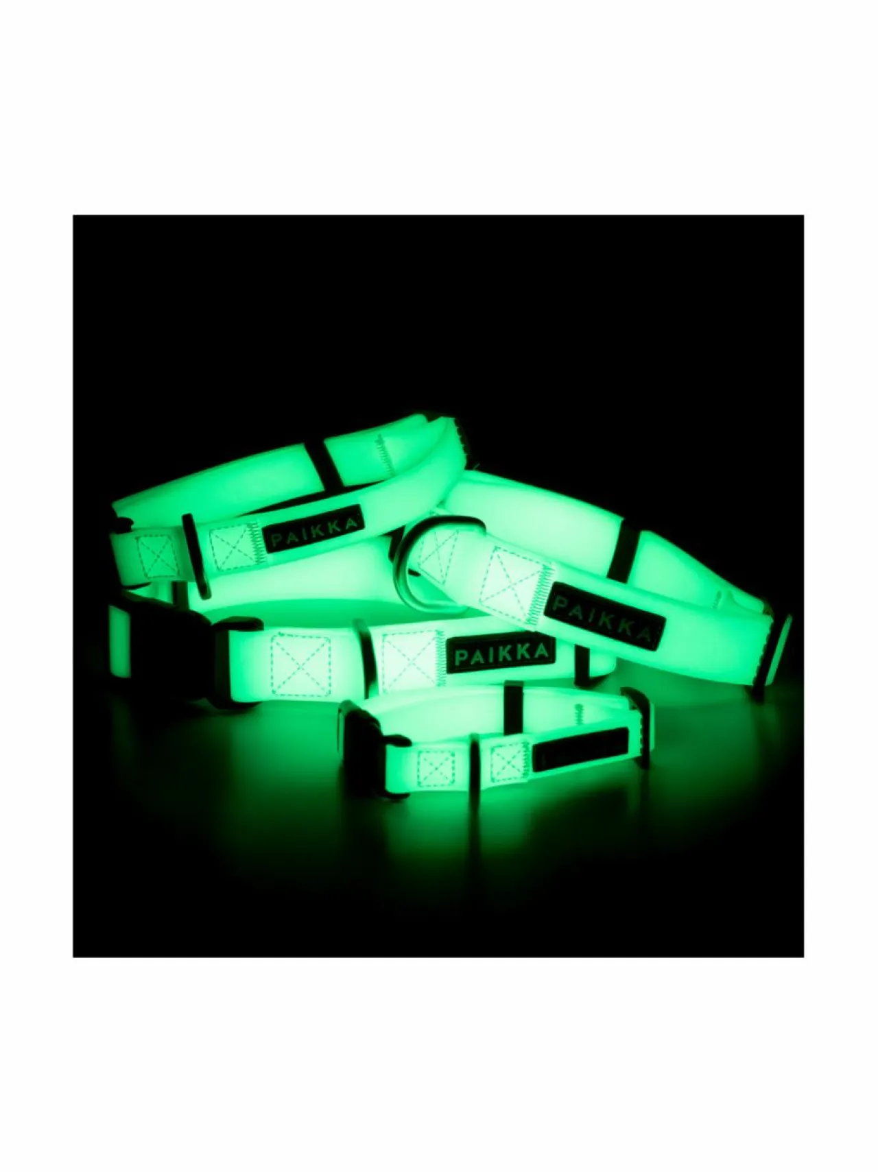 Fluoresoivasta materiaalista valmistettu kaulapanta hohtaa kirkkaasti pimeässä altistuttuaan valolle, mikä varmistaa näkyvyyden hämärässäkin. PAIKKA Hohtokaulapanta on näyttävä, mutta suunniteltu myös käytännölliseksi ja kestäväksi. Kaulapanta on säädettävä mukavuuden ja varman kiinnityksen takaamiseksi.