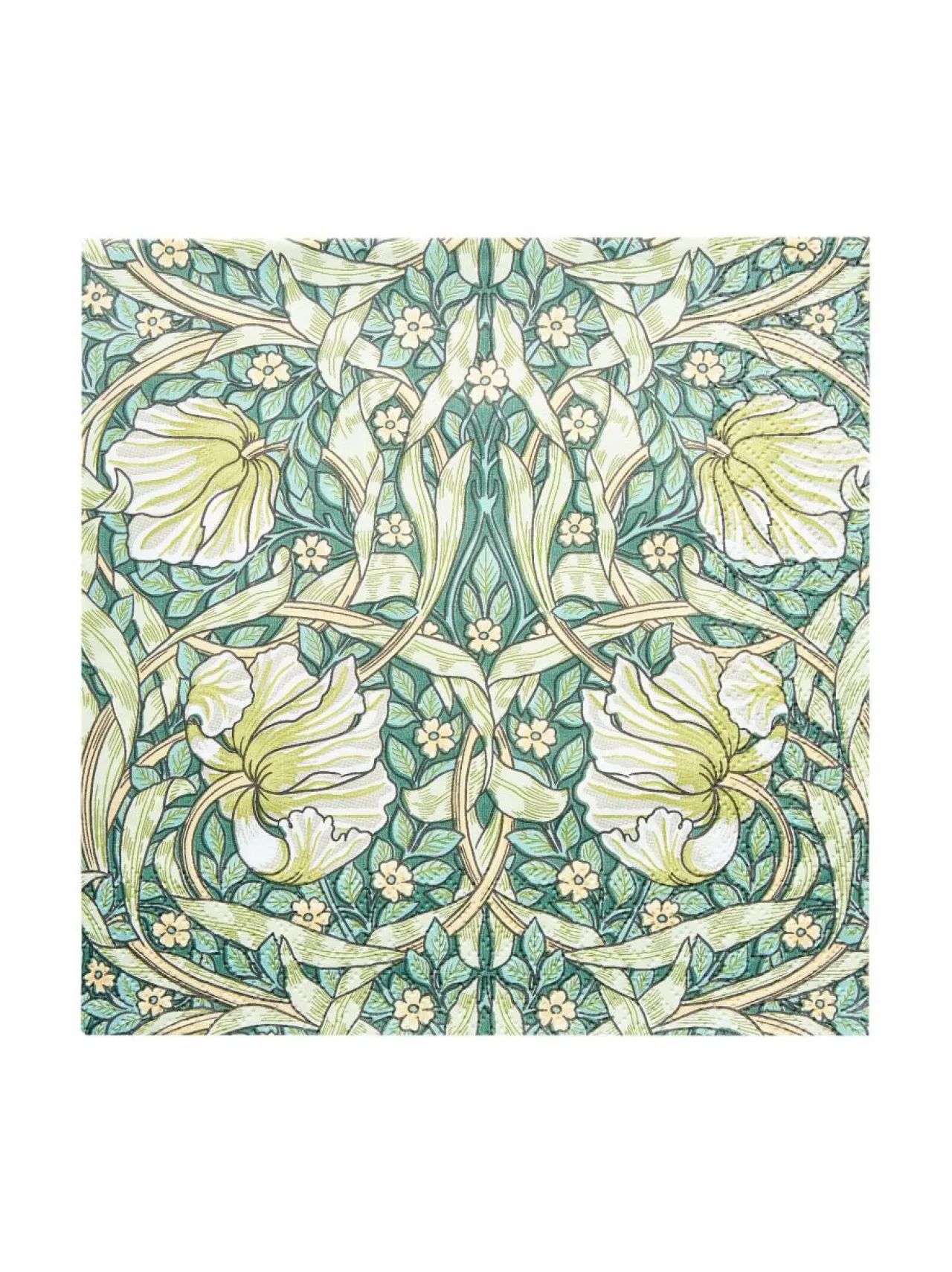 Upeat brittiläisen suunnittelijan William Morrisin vihreän sävyiset Pimpernel-kuosiset lautasliinat. Pimpernel on suunniteltu vuonna 1876 ja on yksi William Morrisin tunnetuimmista ja rakastetuimmista kuoseista. Kuosia koristavat näyttävät tulppaanit, niiden ympärille kietoutuneet lehdet sekä pienet peltopunka-kukat. Kotimaiset lautasliinat ovat Havin valmistamat ja ne on painettu Imatralla 3-kertaiselle pehmopaperille. Lautasliinoille on myönnetty Avainlippu ja Joutsenmerkki. Pakkauksessa on 20 lautasliinaa.