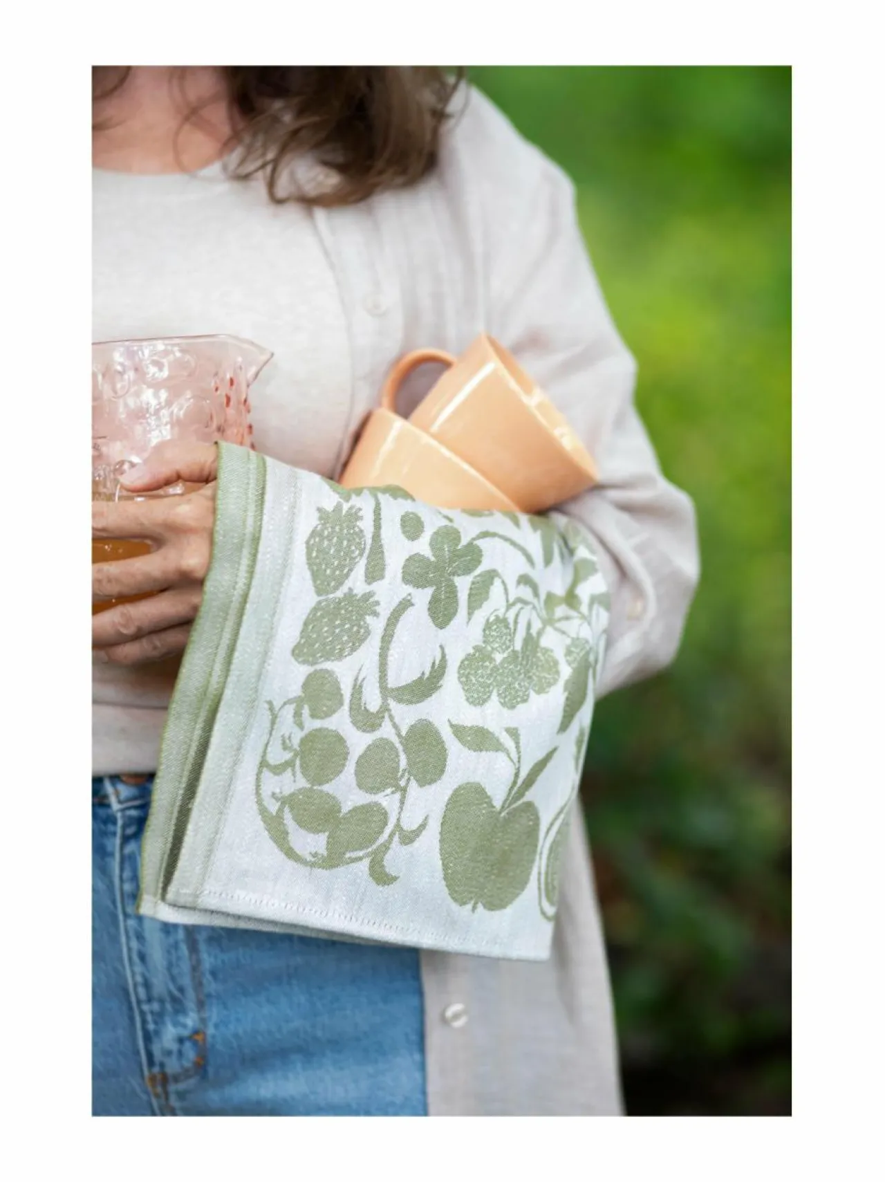 Puutarha-kuosin on suunnitellut Saara Obele. Kuosi on yhtä runsas kuin taitavan puutarhurin pöydän antimet. Mikään ei maistu yhtä hyvältä kuin omassa maassa lempeällä huolenpidolla kasvanut ruoka, joka nautitaan yhdessä, lähimpien ympäröimänä elonkorjuun aikaan. Puutarha-pyyhe sopii hyvin myös servietiksi tai pieneksi liinaksi. Tuotteessa on ripustin yhdessä kulmassa. Tuote on valmistettu pellavasta ja bio-orgaanisesta puuvillasta.