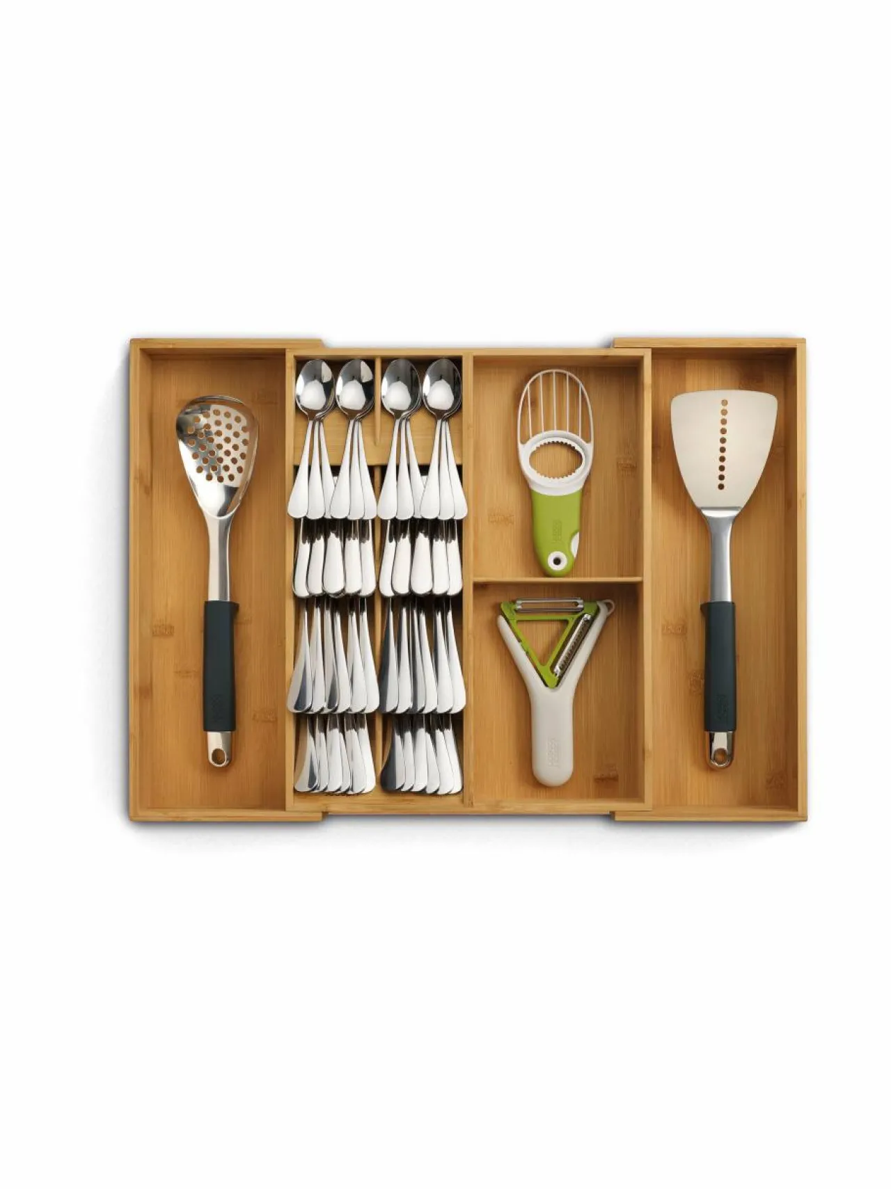 Tuotenumero167909635 MateriaaliBambua Hoito-ohjeetPyyhi kostealla liinalla ja kuivaa käsin (älä liota). Öljyä säännöllisesti elintarviketurvallisella öljyllä. ValmistusmaaKiina VäriBROWN Koko6,8 x 32 x 40 cm Avainsanatjoseph joseph, keittiö, säilytys, aterinlaatikko, aterinteline, aterinlokero, laajennettava, järjestäjä, bambu