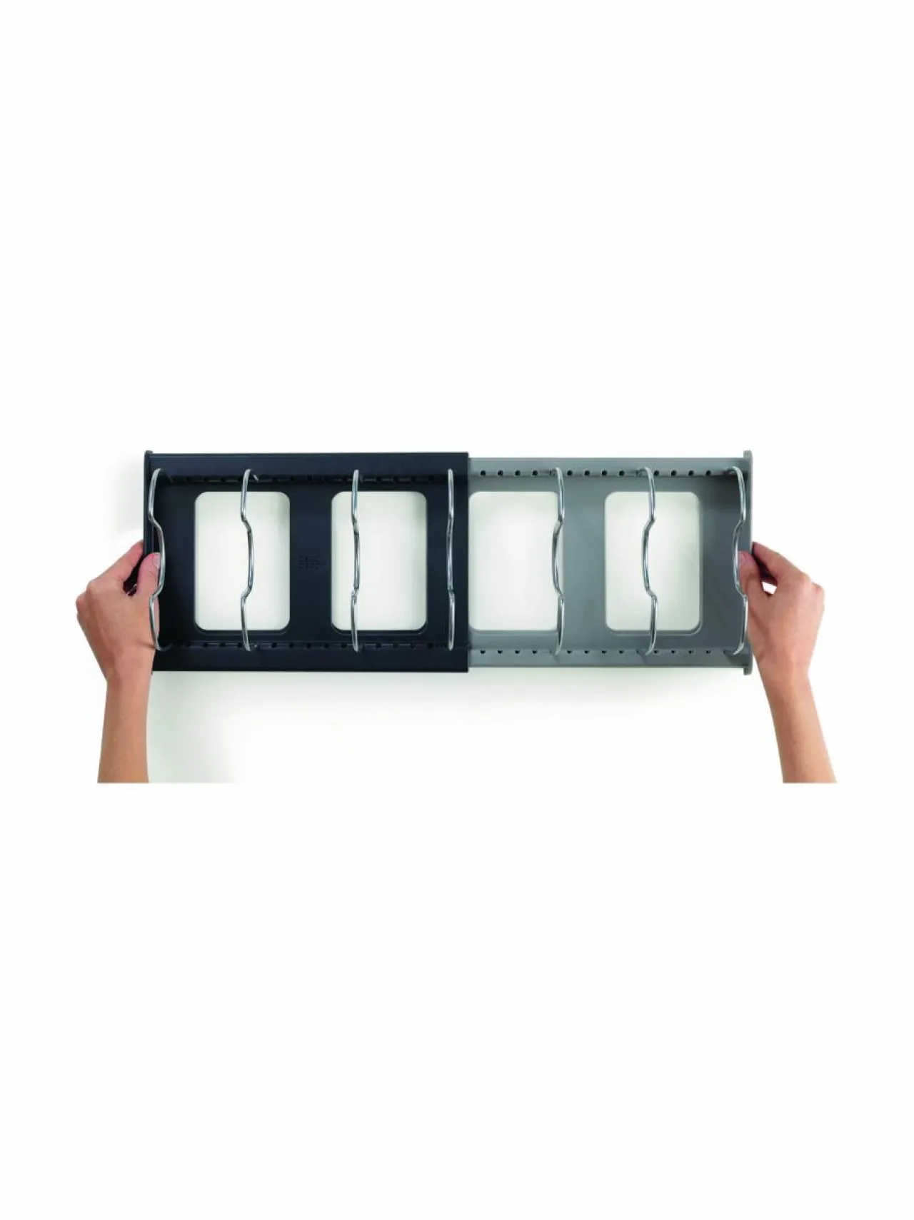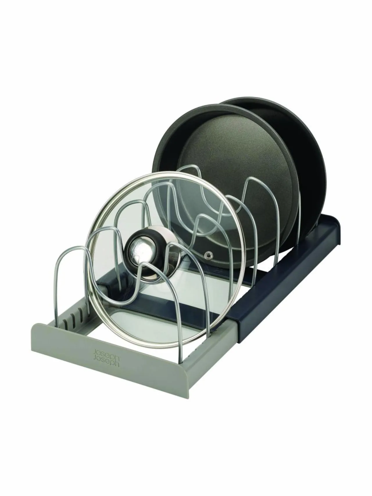 Kokkaustarviketelineellä järjestelet helposti erikokoisia pannuja, kattilan kansia ja kakkuvuokia. Teline on suunniteltu juuri erikokoisten ja -muotoisten tarvikkeiden varastoimiseen. Sen pituutta voi säätää 30,5 sentistä 56 cm asti. Ihanteellinen käytettäväksi kaapin sisällä. Valmistettu muovista, kumista ja ruostumattomasta teräksestä.