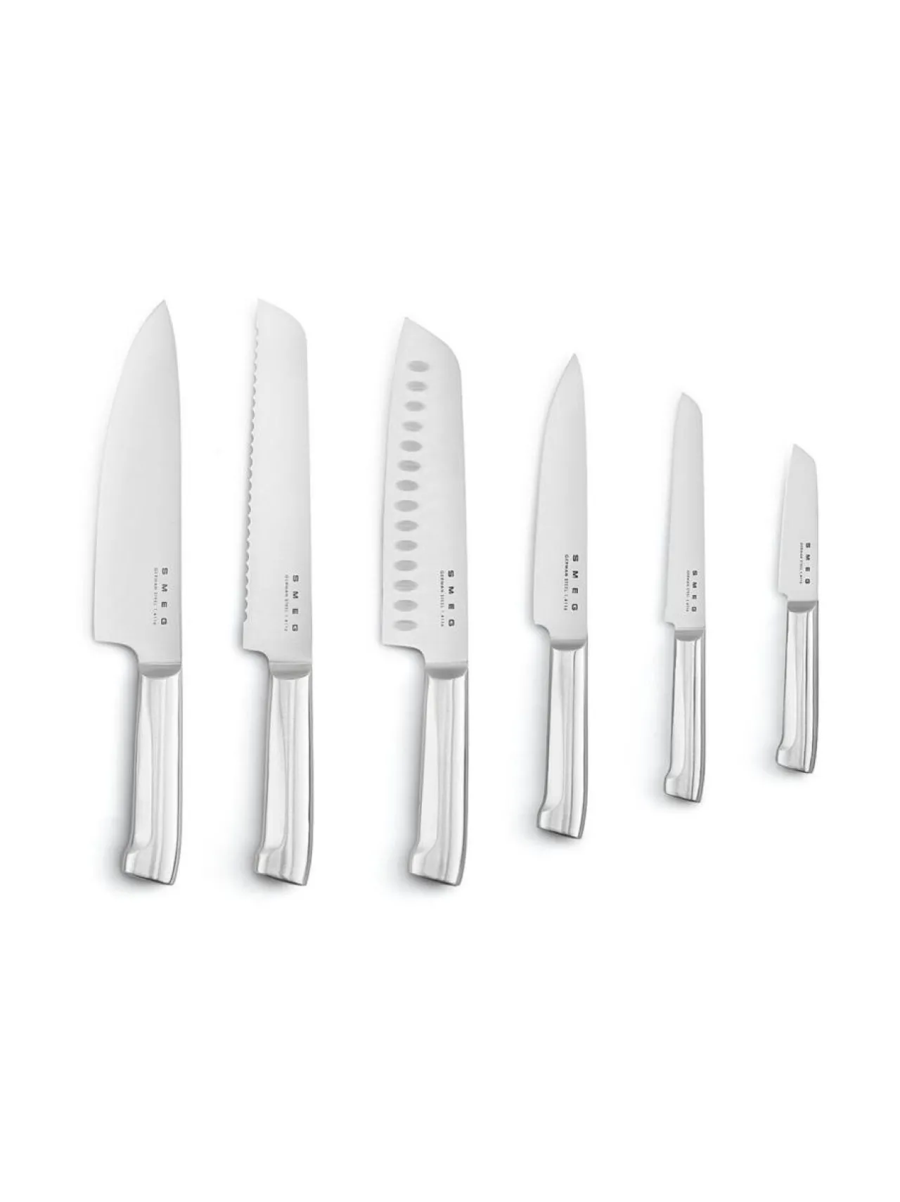 Smeg KBSF02BL -mustassa veitsisetissä veitsesi ovat järjestyksessä ja suojassa tyylillä. Italialainen muotoilu ja erinomainen käyttökokemus kohtaavat Smegin uudessa kuuden osan veitsisarjassa, joka on suunniteltu vaativaan ruoanlaittoon ja sisustustietoisen kokin keittiöön. Monipuolisessa veitsisetissä on kuorimaveitsi, sahalaitainen yleisveitsi, lihaveitsi, Santoku-veitsi, leipäveitsi ja kokinveitsi.