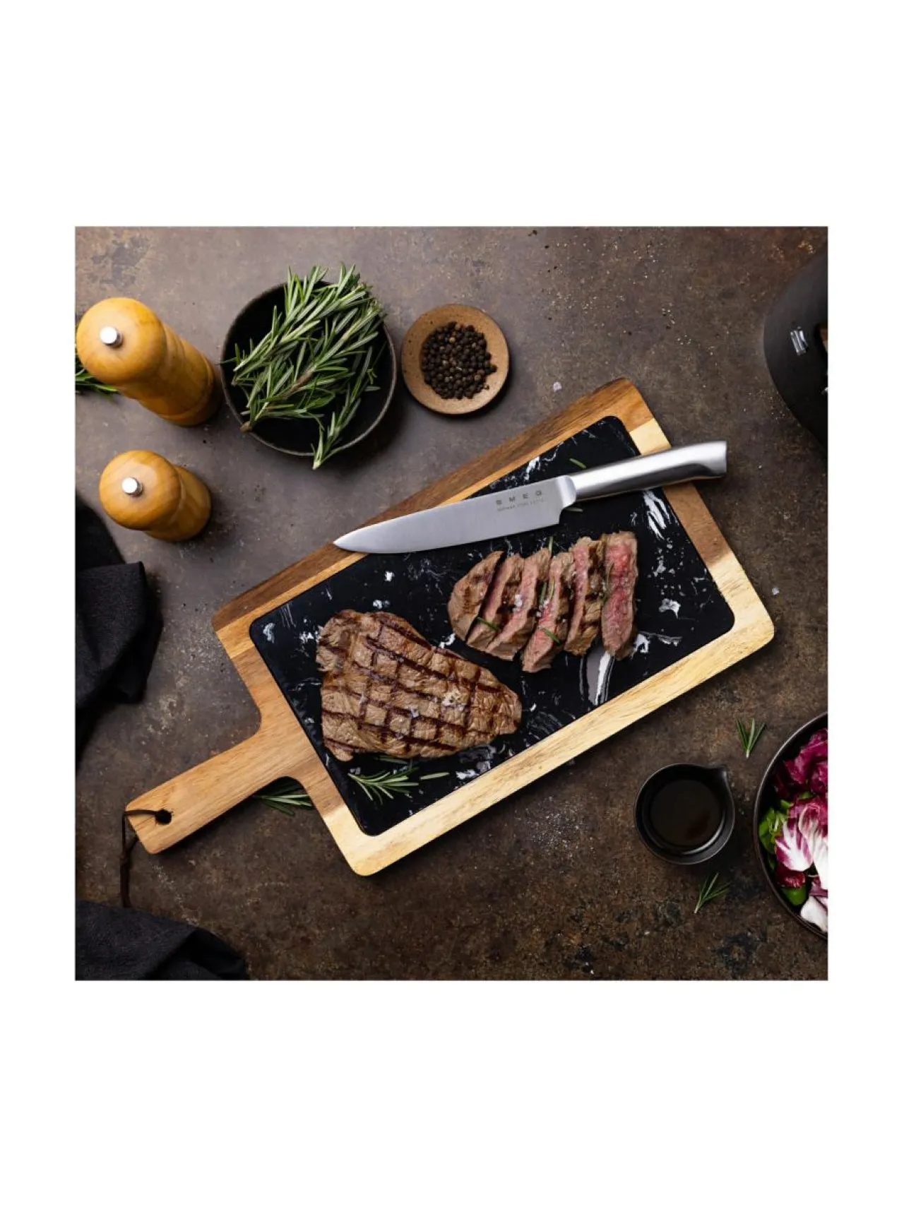 Jokainen veitsi on valmistettu saksalaisesta ruostumattomasta teräksestä, joka takaa pitkäikäisyyden, terävyyden ja erinomaisen tasapainon. Veitsitukki on valmistettu akaasiapuusta ja sen runko on mustaksi jauhemaalattua hiiliterästä. Veitsiaukot ovat kaunista akaasiapuuta. Veitsien ergonominen kahva istuu täydellisesti käteen, tarjoten tarkkuutta niin leikkaamiseen, viipalointiin kuin silppuamiseenkin.