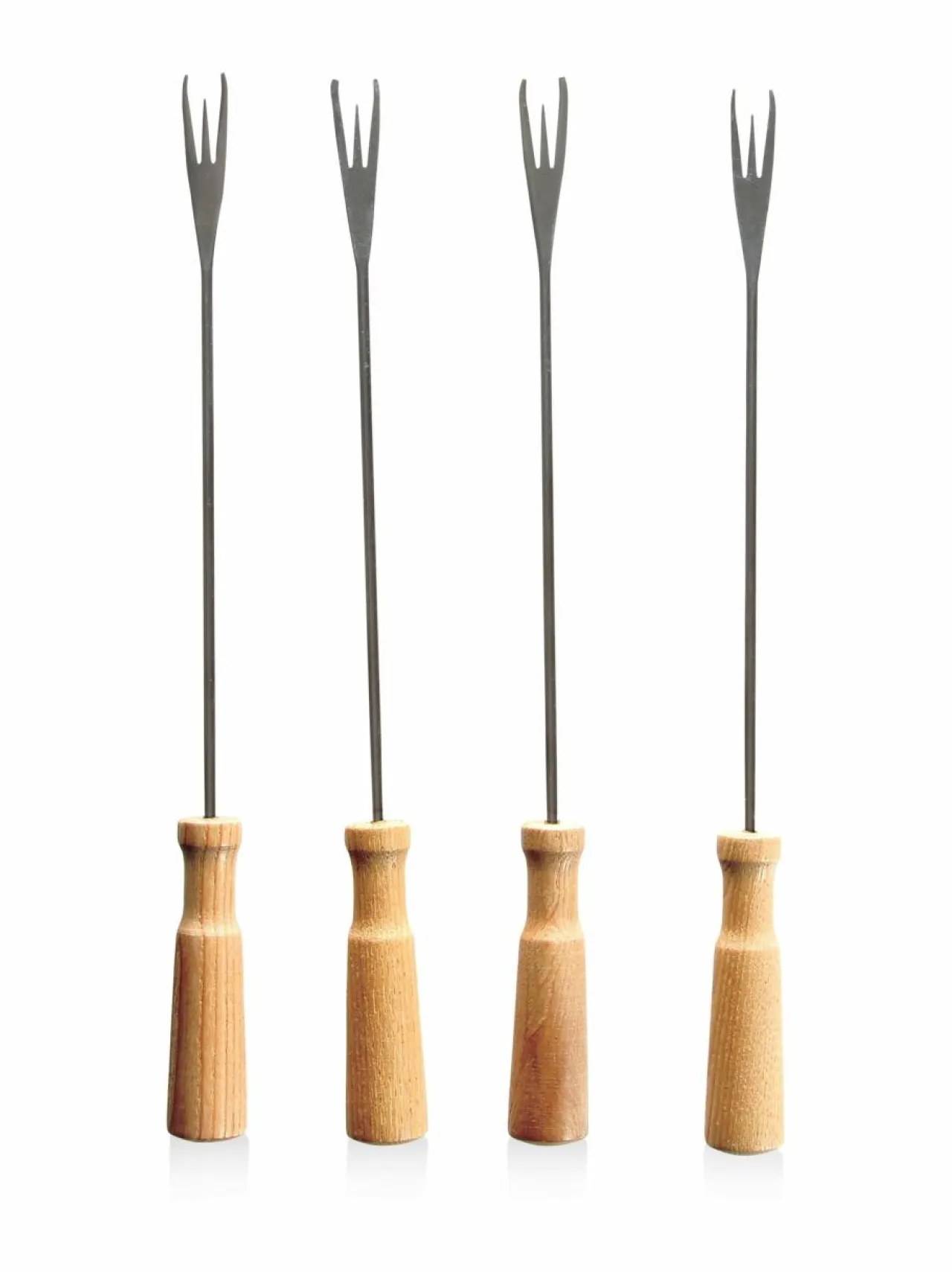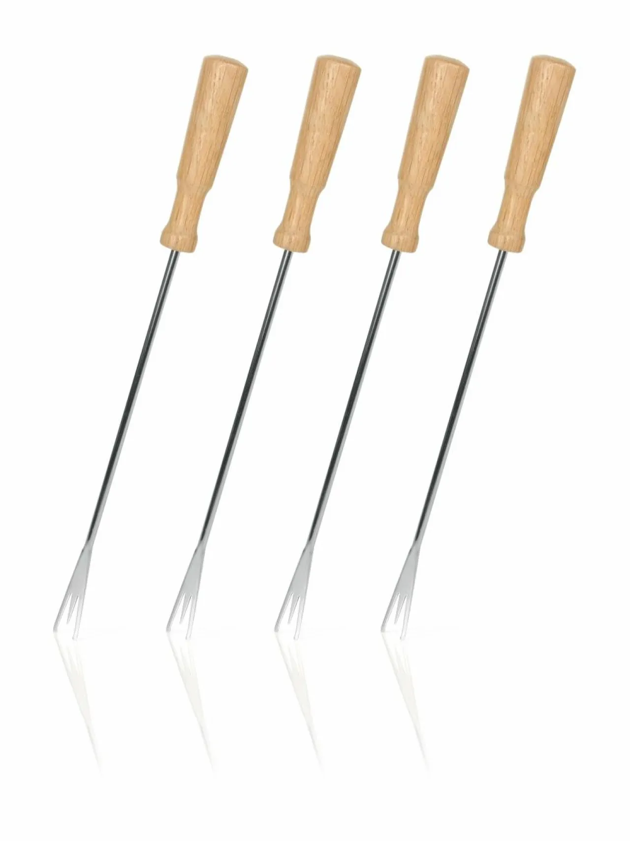 Tyylikkäät ja käytännölliset fonduehaarukat sopivat fonduejuhlaan sekä juuston että suklaan kanssa. Fonduehaarukat on valmistettu ruostumattomasta teräksestä, ja niiden varret ovat tammea. Pakkauksessa on neljä haarukkaa. Valmistajan takuu on 10 vuotta.