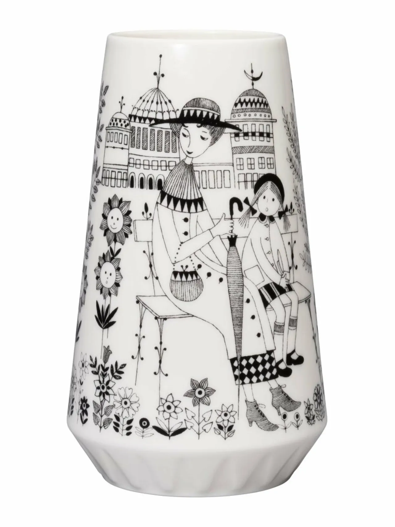 Mestarikuvittaja Raija Uosikkisen Emilia on rakastettu kuvio vuodelta 1957. Ainutlaatuinen koriste kertoo huolettomista päivistä ja onnnellisista hetkistä ystävien kanssa ja jatkuu erilaisena sarjan esineestä toiseen. Sarjan maljakko sopii varsinkin lyhytvartisille kukille, mutta on kaunis esine sisustuksessa sellaisenaankin. Kaunis lahjaidea.