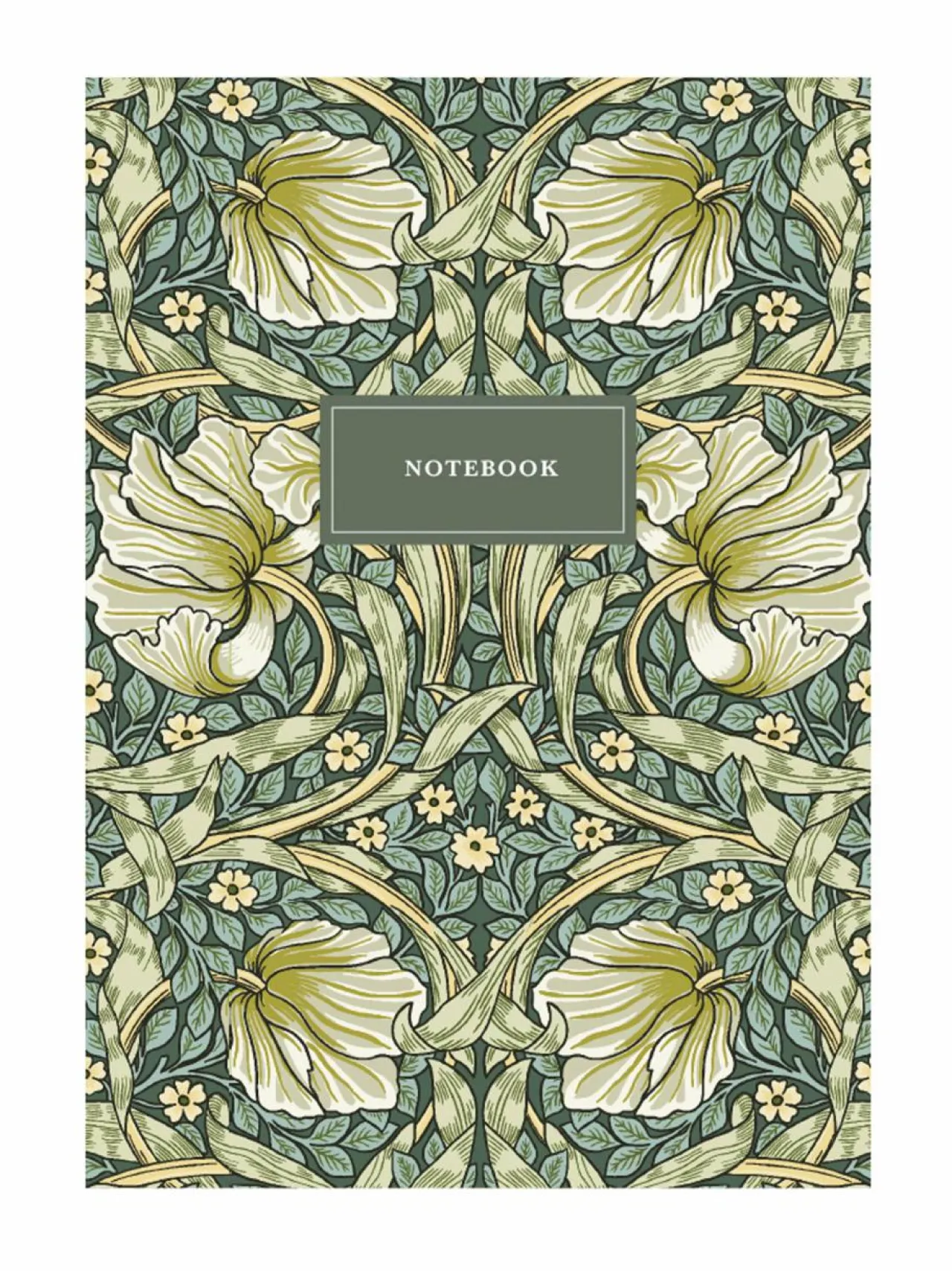 William Morris kovakantinen muistikirja A5 Pimpernel-kuosilla. A5 kokoisessa kovakantisessa muistikirjassa on viivoitetut sivut ja lukunauha.