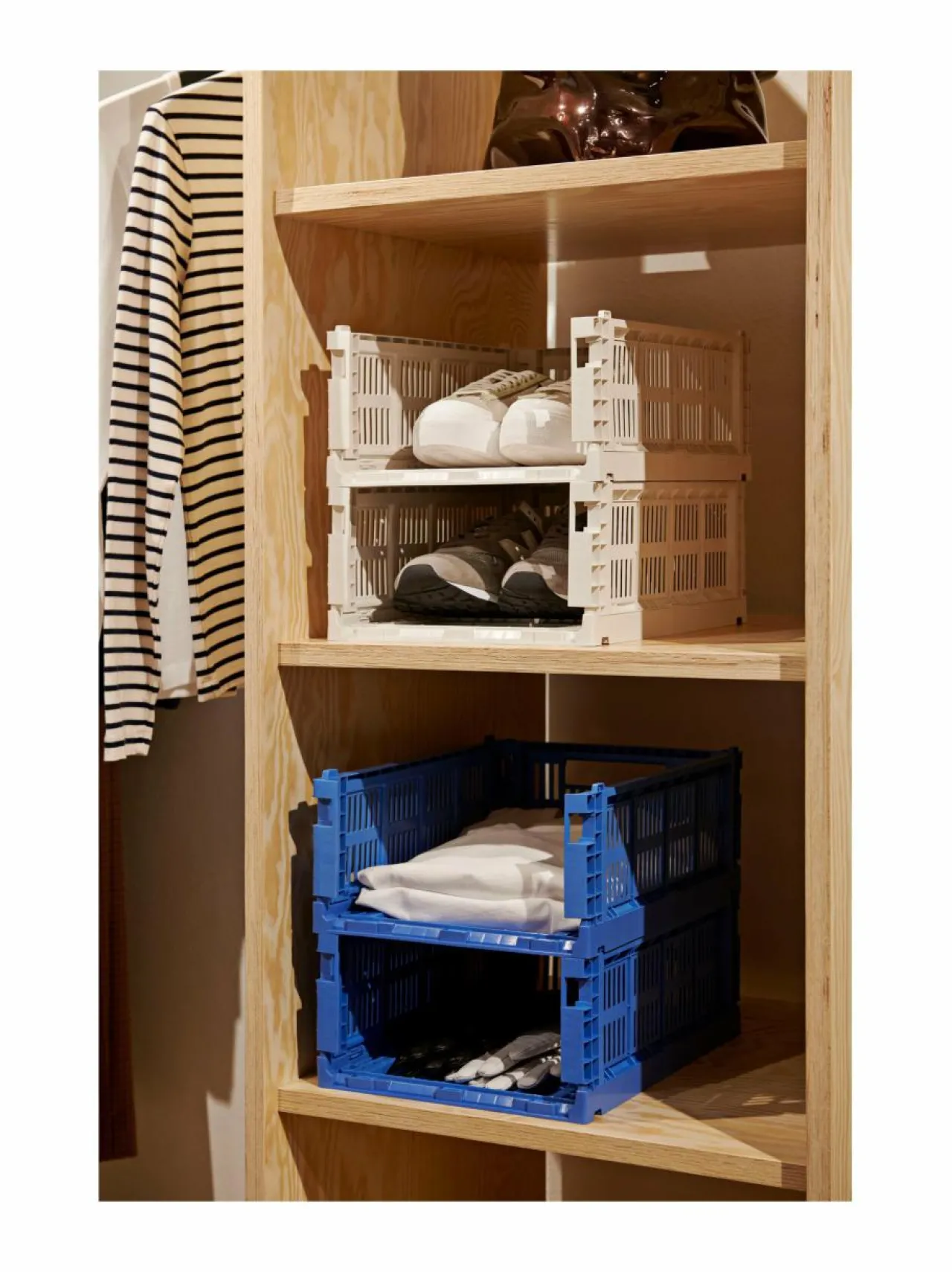 HAYn Colour Crate -kokoelman säilytyskorit tuovat kodin järjestämiseen näppärää teollista estetiikkaa sekä funktionaalista muotoilua. Kompaktit, pinottavat muovikorit tarjoavat oivan ja helposti muunneltavan säilytyspaikan niin leluille kuin toimistotarvikkeille, ja niiden ilmava ja rei’itetty rakenne sopii hyvin myös ruokien ja kylpyhuonetarvikkeiden säilytykseen. Korin valmistukseen on käytetty kierrätyspolypropeeniä.