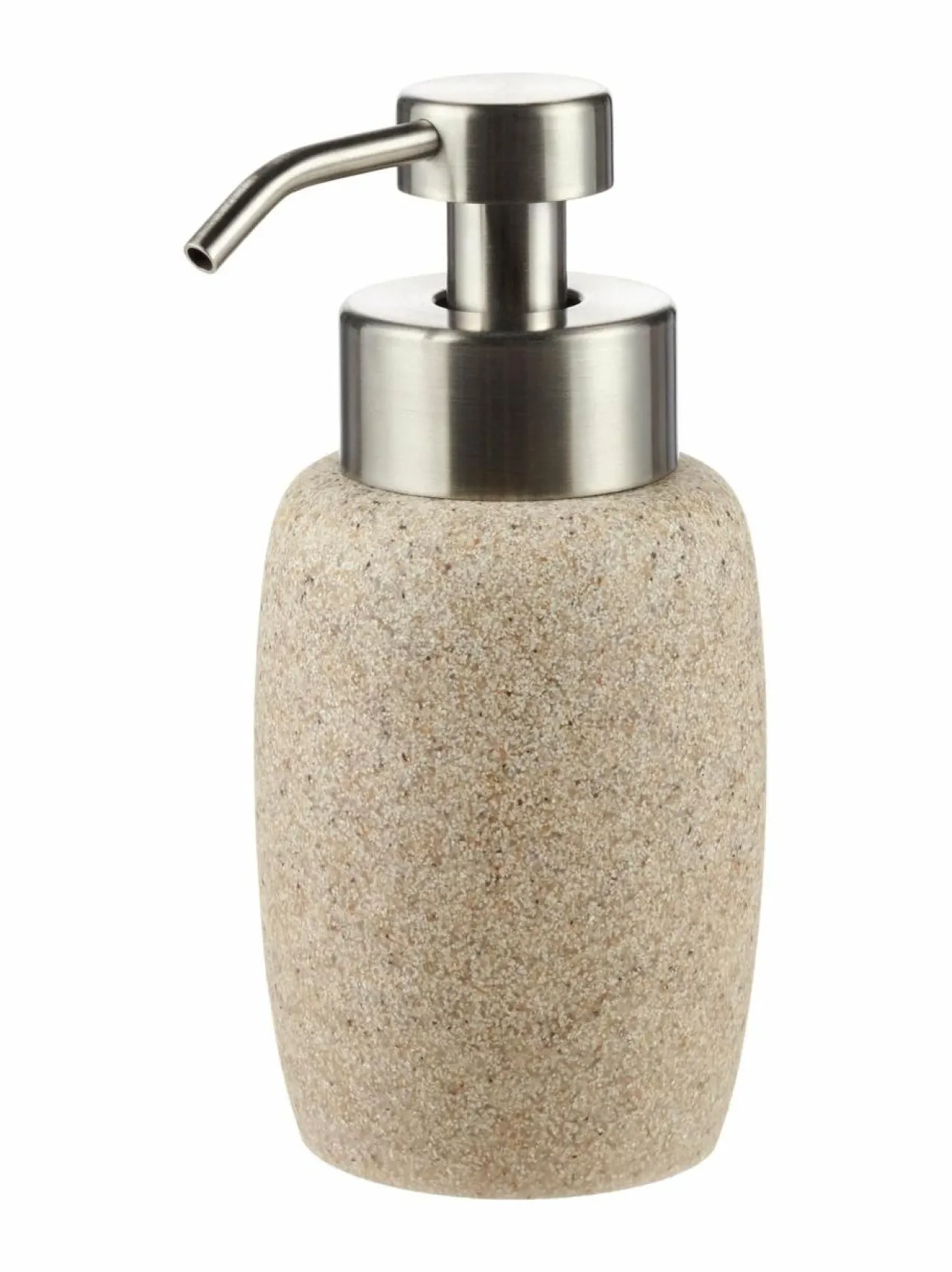 Tyylikkäässä vaahtosaippuapumpulla toimivassa annostelijassa on rantahiekkaa muistuttava kiteinen, sileä pinta. Annostelijaan kaadetaan vedellä laimennettu saippua.