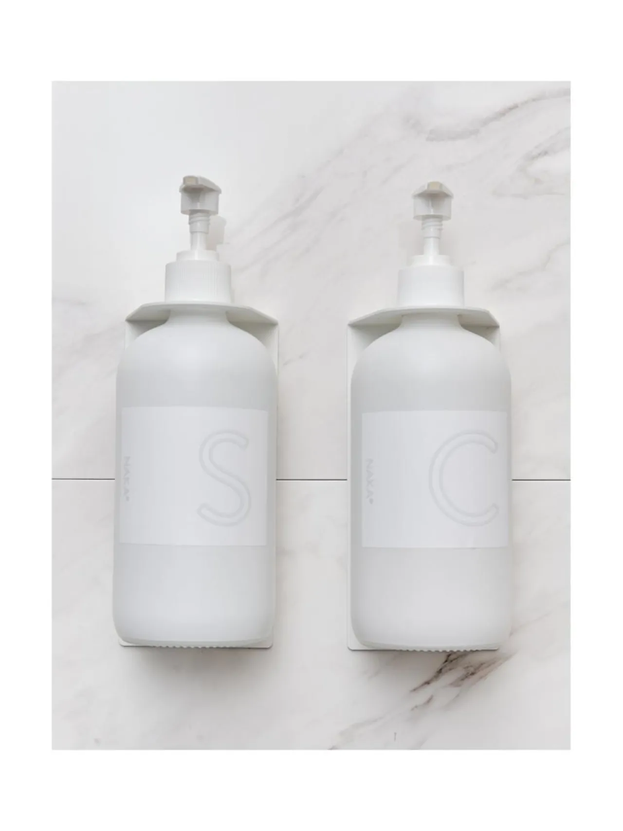 NAKA® pumppupulloteline, helppo RUUVITON teippikiinnitys. Teline kestää hyvin kosteutta, joten se voidaan asentaa suihkuun.