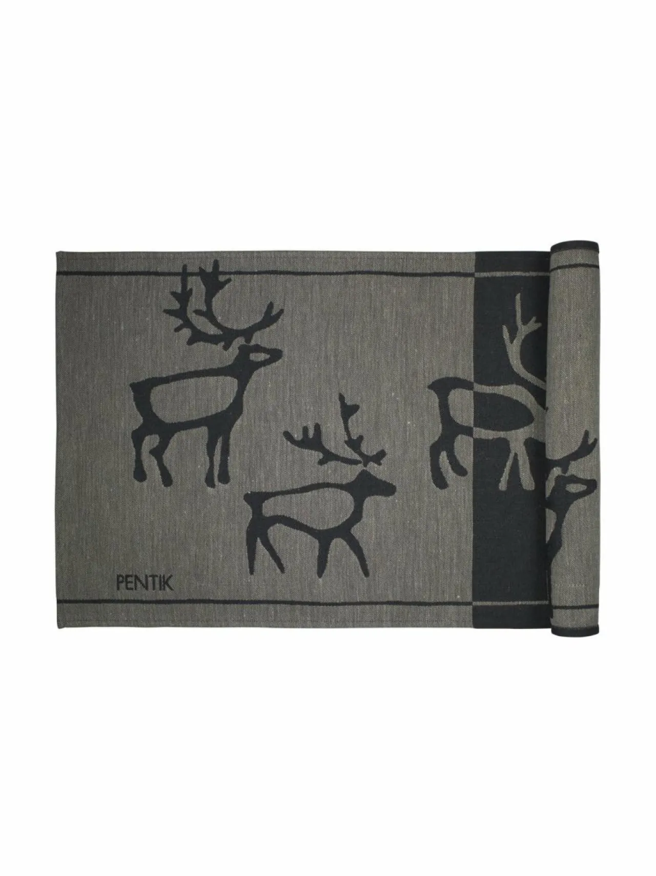 Pentikin Saaga-laudeliinaa somistaa Minna Niskakankaan suunnittelema porokuosi. Laudeliina on valmistettu miellyttävän tuntuisesta pellavan ja puuvillan sekoitteesta.