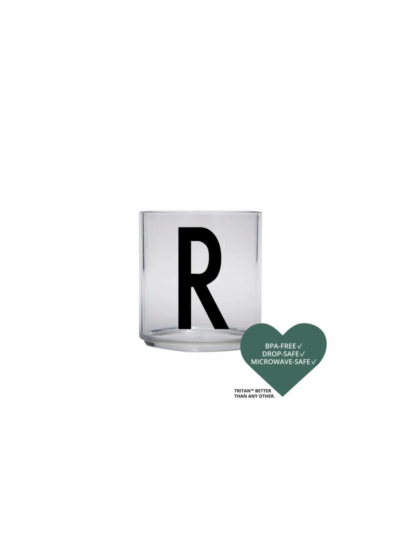 Design Lettersin lasten juomalasia koristavan yksinkertaisen tyylikkään typografian on suunnitellut Arne Jacobsen. Lasi on valmistettu kestävästä Tritan-muovista, joka ei sisällä myrkyllisiä kemikaaleja. Mikronkestävän lasin voi pestä astianpesukoneessa. Halkaisija on 6,5 cm ja korkeus 7,2 cm.