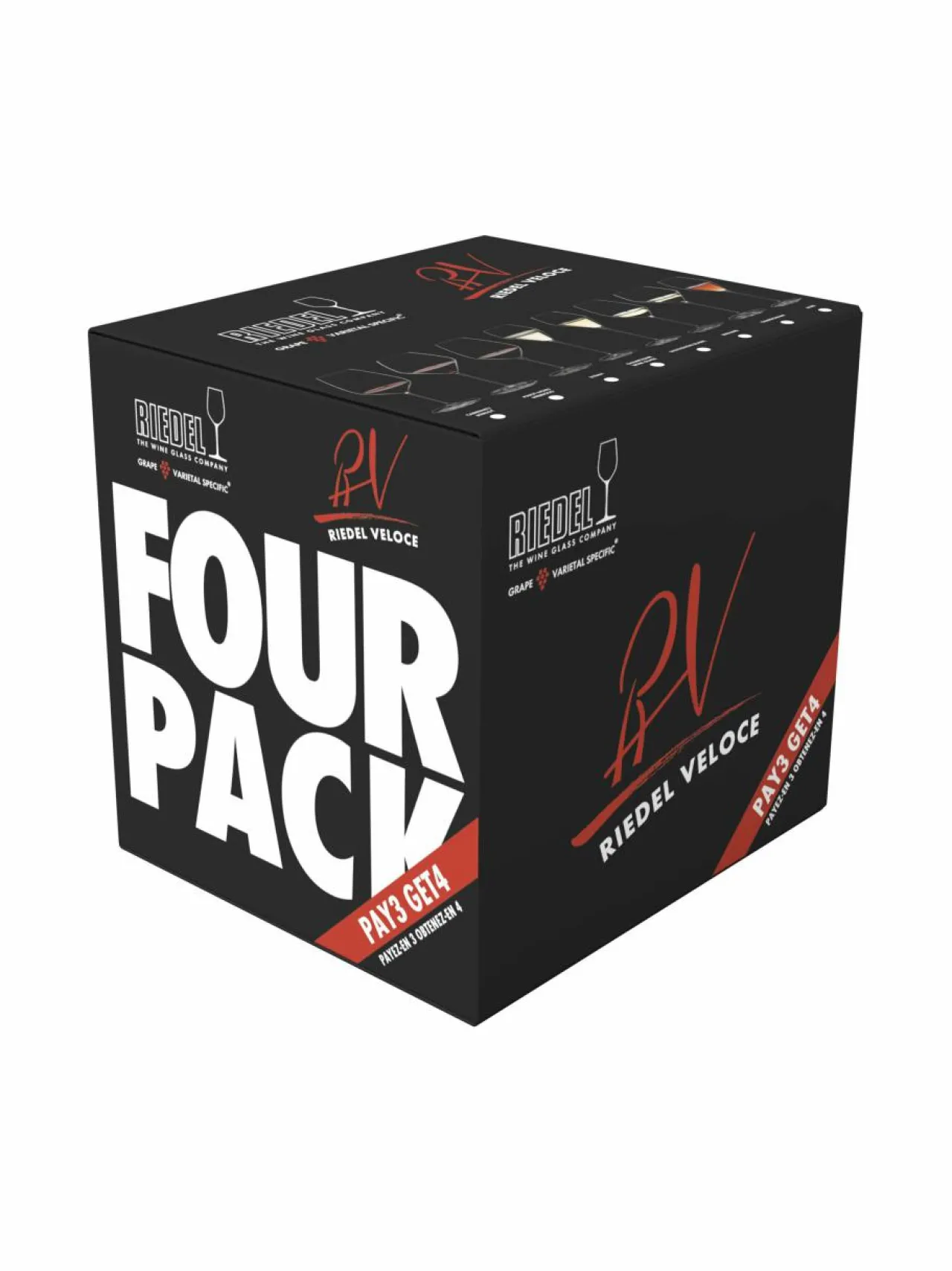 Riedelin Veloce-sarjan samppanjalaseilla on timanttimuoto, joka mahdollistaa laajan aromaattisen paletin avautumisen, lasin kulmat tarjoavat enemmän tilaa aromien kehittymiseen. Lasin pohjassa on myös ”kuohupiste”, joka auttaa kuplien muodostumisessa ja korostaa makua. Pakkaus sisältää yhteensä 4 samppanjalasia.