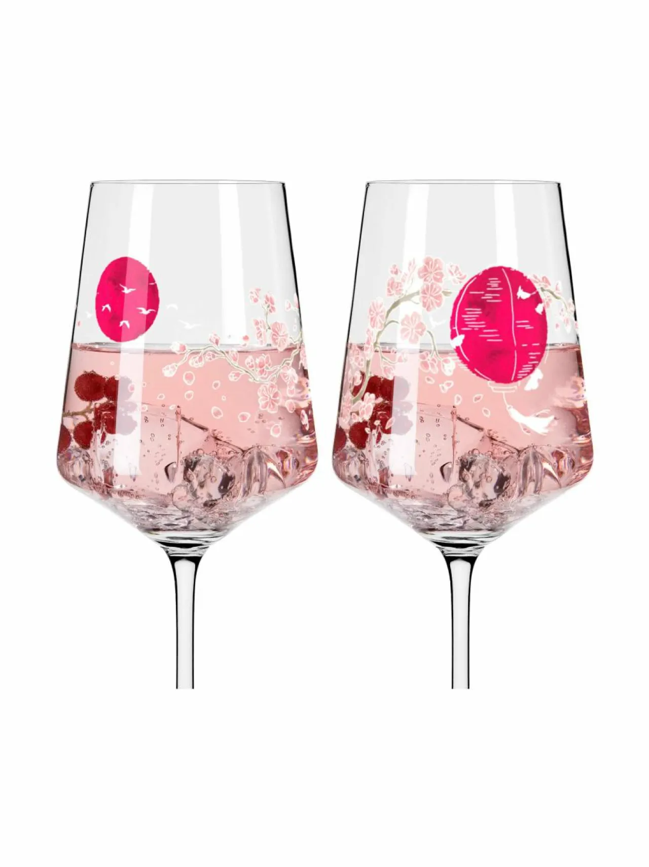 Ritzenhoff Sommersonett Sprizz -kahden lasin pakkaus soveltuu ihanteellisesti erilaisten aperitiivijuomien ja cocktailien tarjoiluun. Juomalasin vetoisuus on 544 ml ja korkeus 22,50 cm. Materiaalina on käytetty astianpesukoneen kestävää kristallia. Melina Sparschu luo digitaalista taidetta ja on suunnitellut tämän lasisetin viehättävän kuvion kirsikankukista ja lyhdyistä.