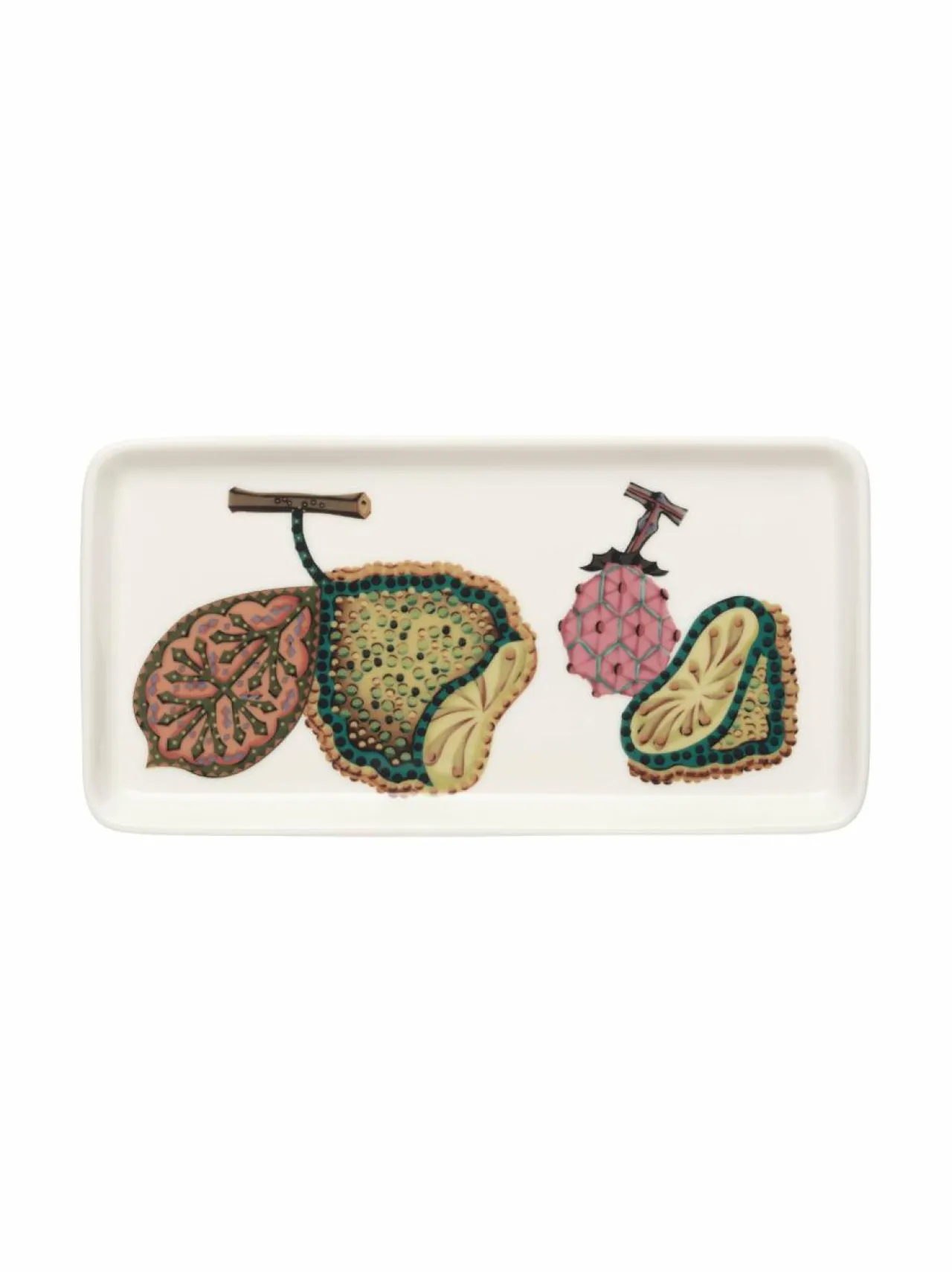 Asetelmataiteen innoittama kuvio luo pysähtyneen tunnelman taianomaisine hedelmineen ja vihanneksineen. Klaus Haapaniemen kiehtovat kuvitukset yhdistyvät Heikki Orvolan pelkistettyihin muotoihin, luoden oman universuminsa. Taika Sato suorakaiteen muotoinen lautanen sopii tarjoiluun ja on kaunis sisustusesine sellaisenaan.