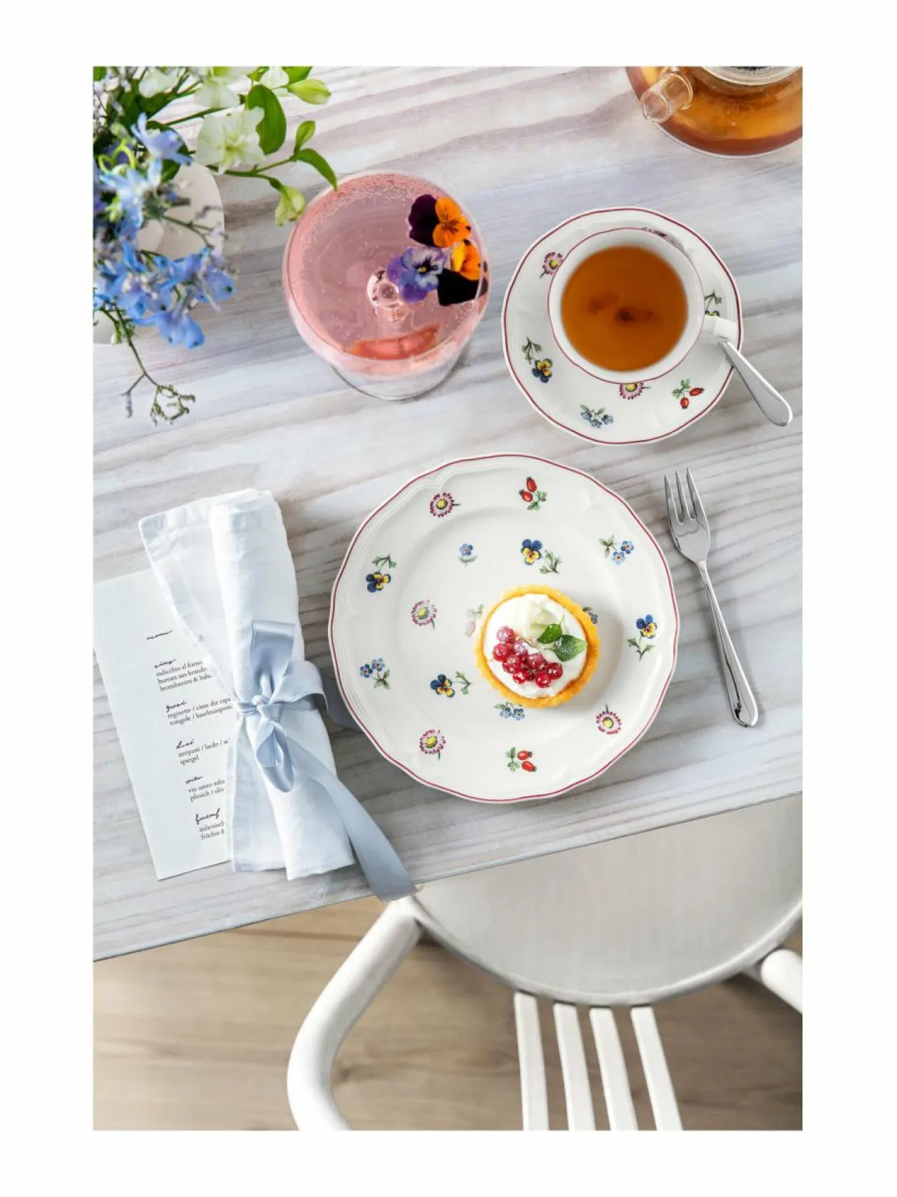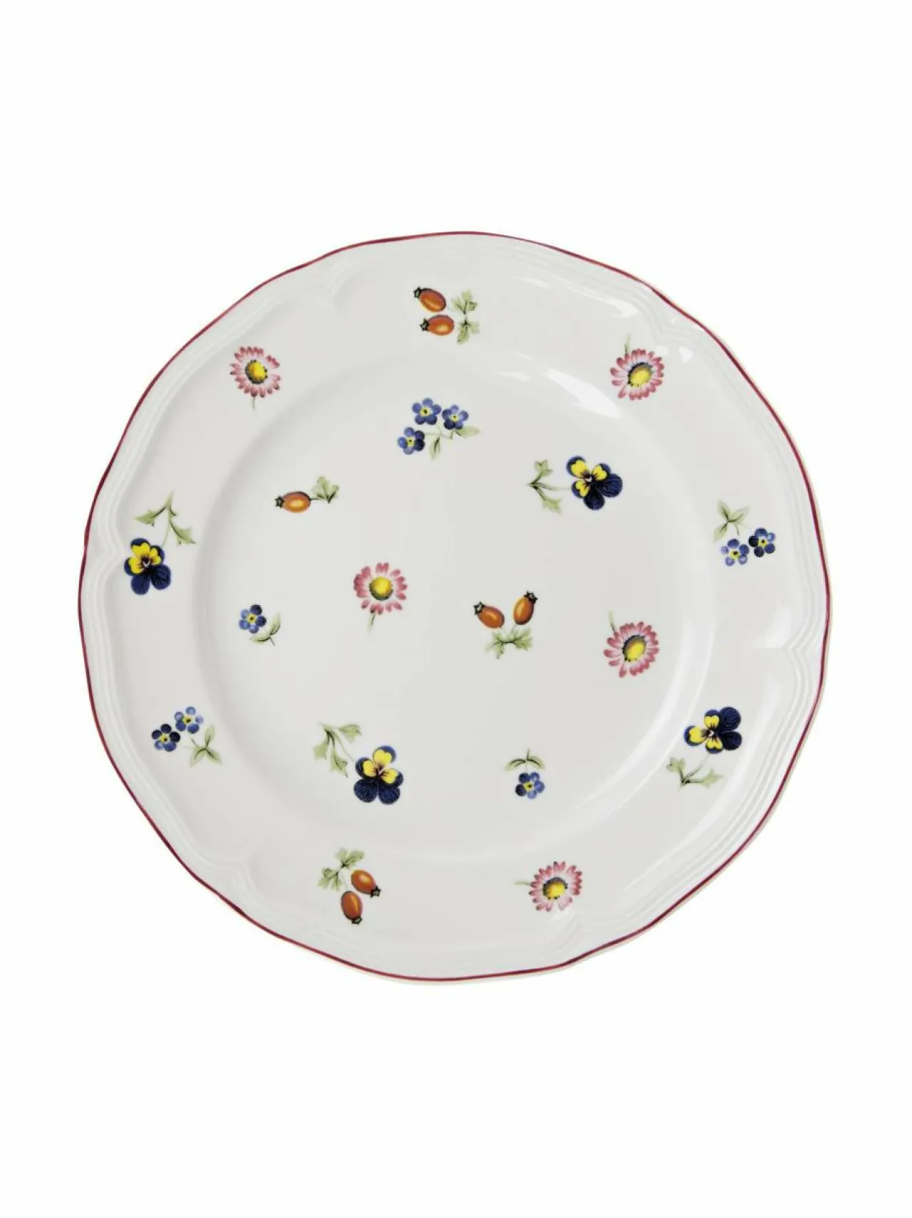Kauniin kukkaisen Petite Fleur -sarjan astiat on valmistettu lasitetusta posliinista. Lautasessa on kohotettu reuna raidallisella ääriviivalla sekä eri kukkien kuviot.