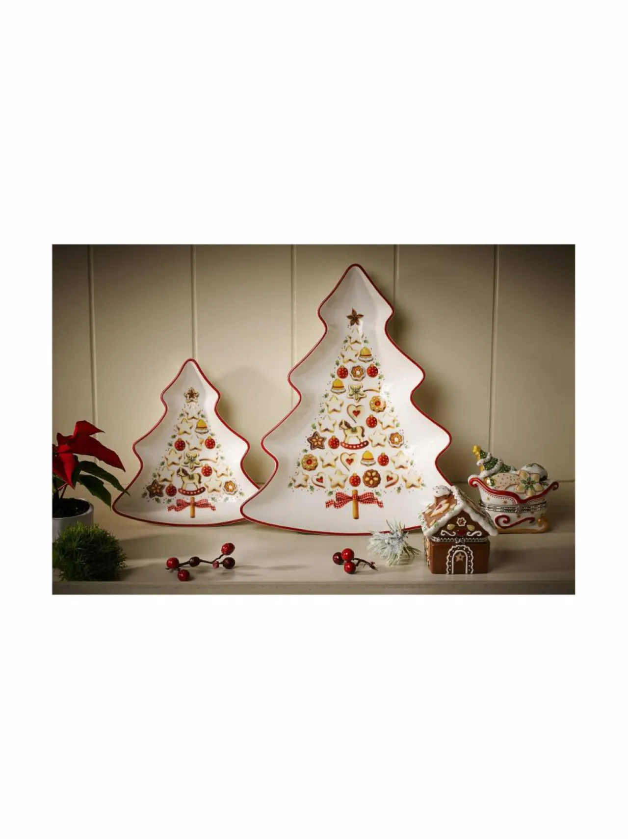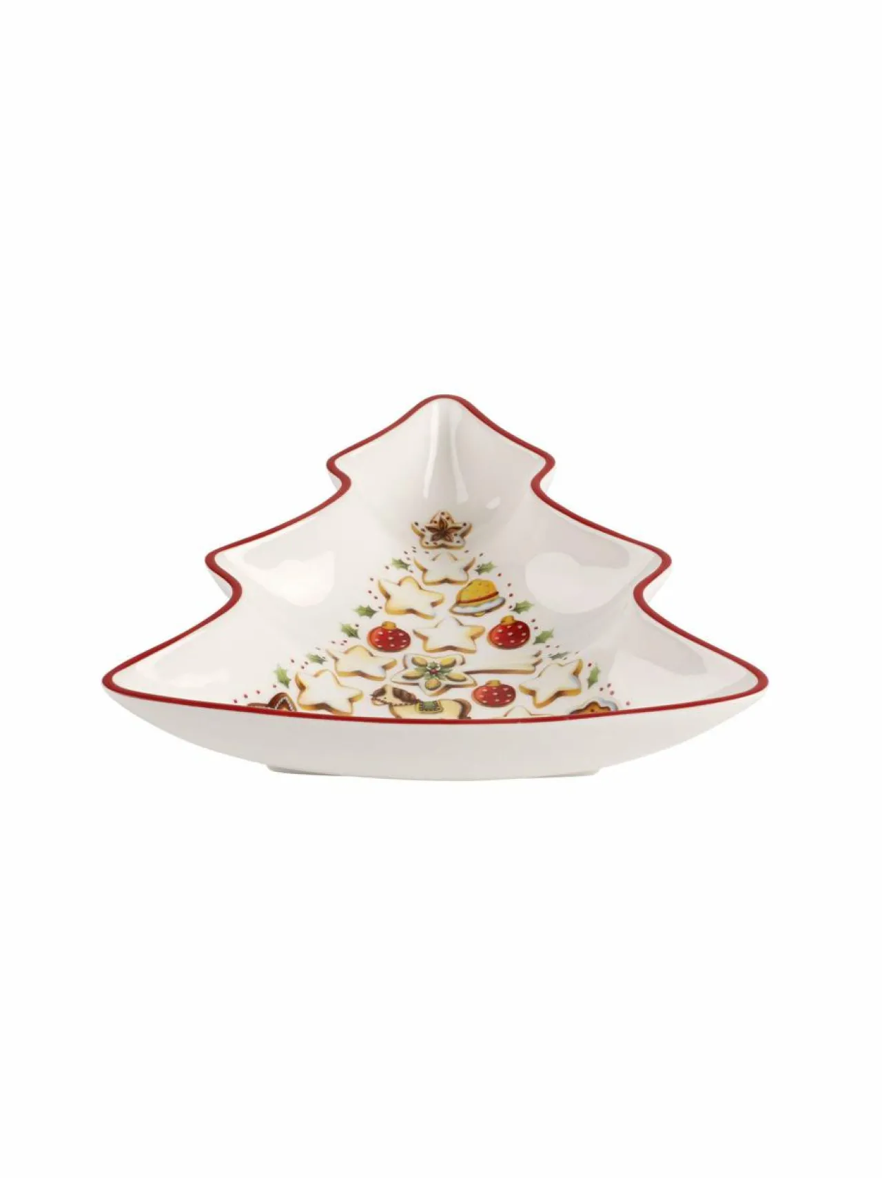 Villeroy & Boch -kuusi tarjoilukulho on täydellinen lisä joulupöytään tai lahjaksi läheisille. Kuusen muotoinen kulho on koristeltu viehättävällä jouluaiheisella kuvituksella, joka tuo juhlan tuntua kattaukseen. Kuvituksessa näkyy piparkakkuja, tähtiä ja muita perinteisiä joulukoristeita, jotka tekevät kulhosta iloisen yksityiskohdan. Reunat on viimeistelty huomiota herättävällä punaisella koristeraidalla, joka kehystää kauniisti posliinin vaaleaa sävyä.