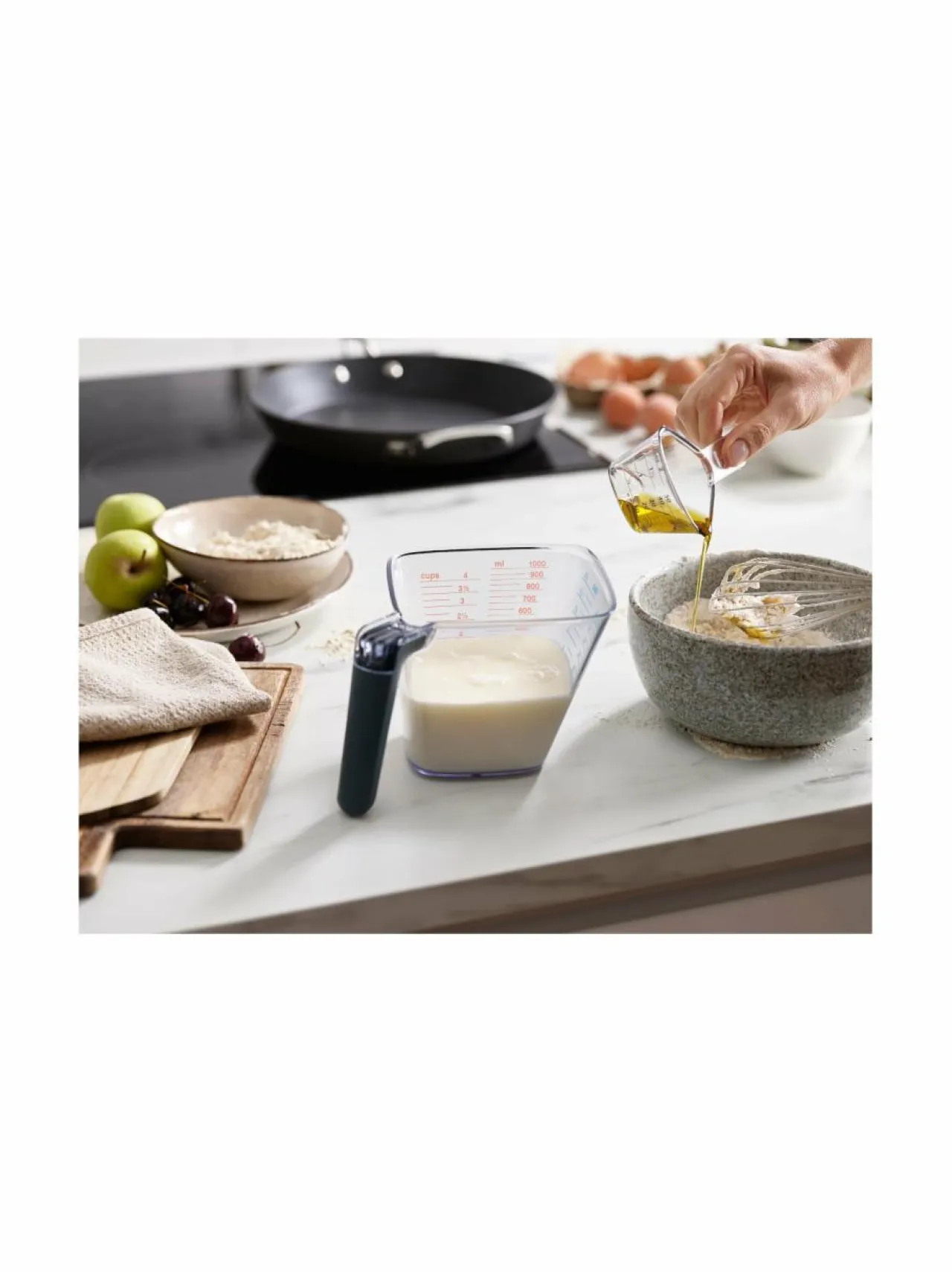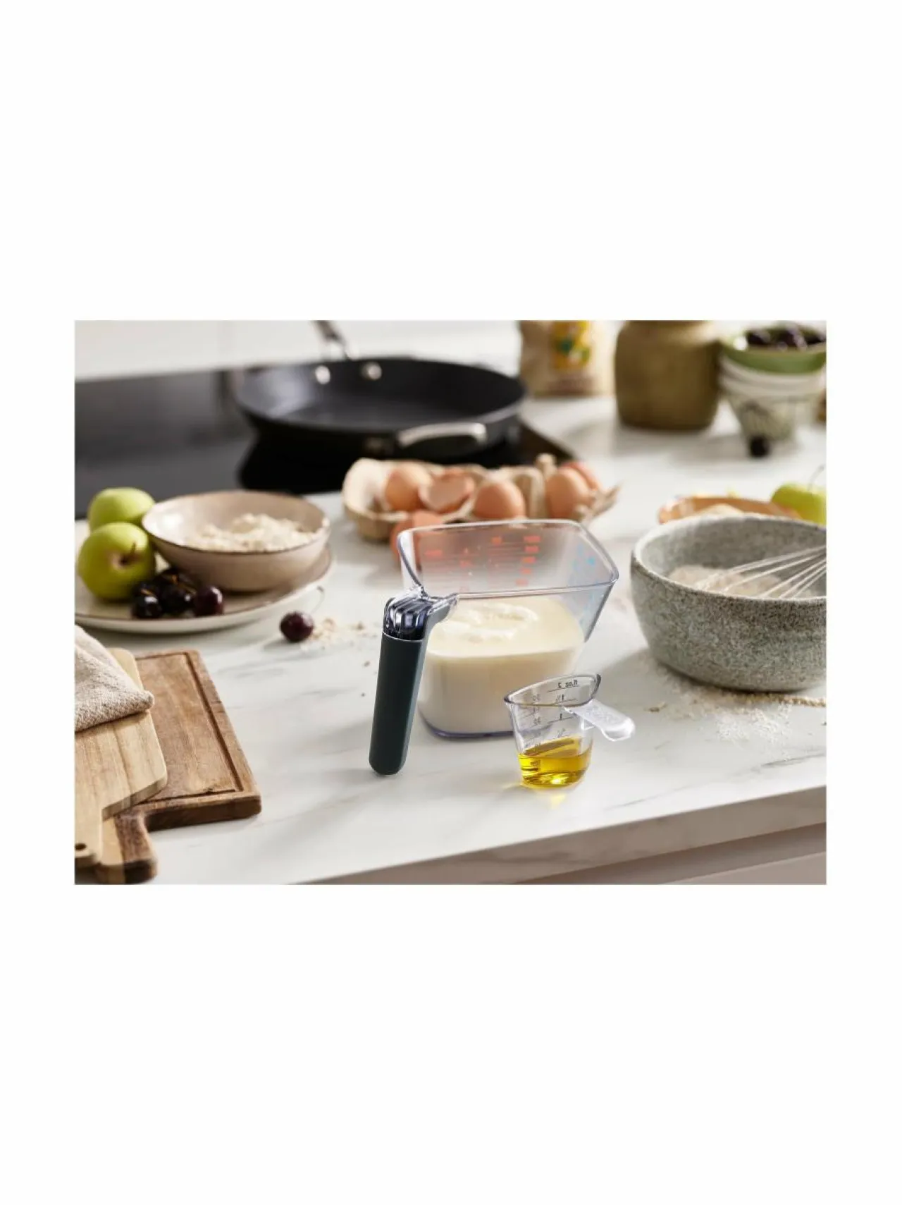Mittakannu mahdollistaa mittojen lukemisen ylhäältä kaataessasi kulhosta nestettä tai muita aineksia. Sen mukana tulee minikannu, jolla voit tarkasti mitata pienempiä määriä, ja se voidaan kiinnittää isomman kannun kädensijaan. Sopii enintään 70C lämpöisille ainesosille. Ison kannun tilavuus on max 1 litra, pienen kannun max 50 ml.