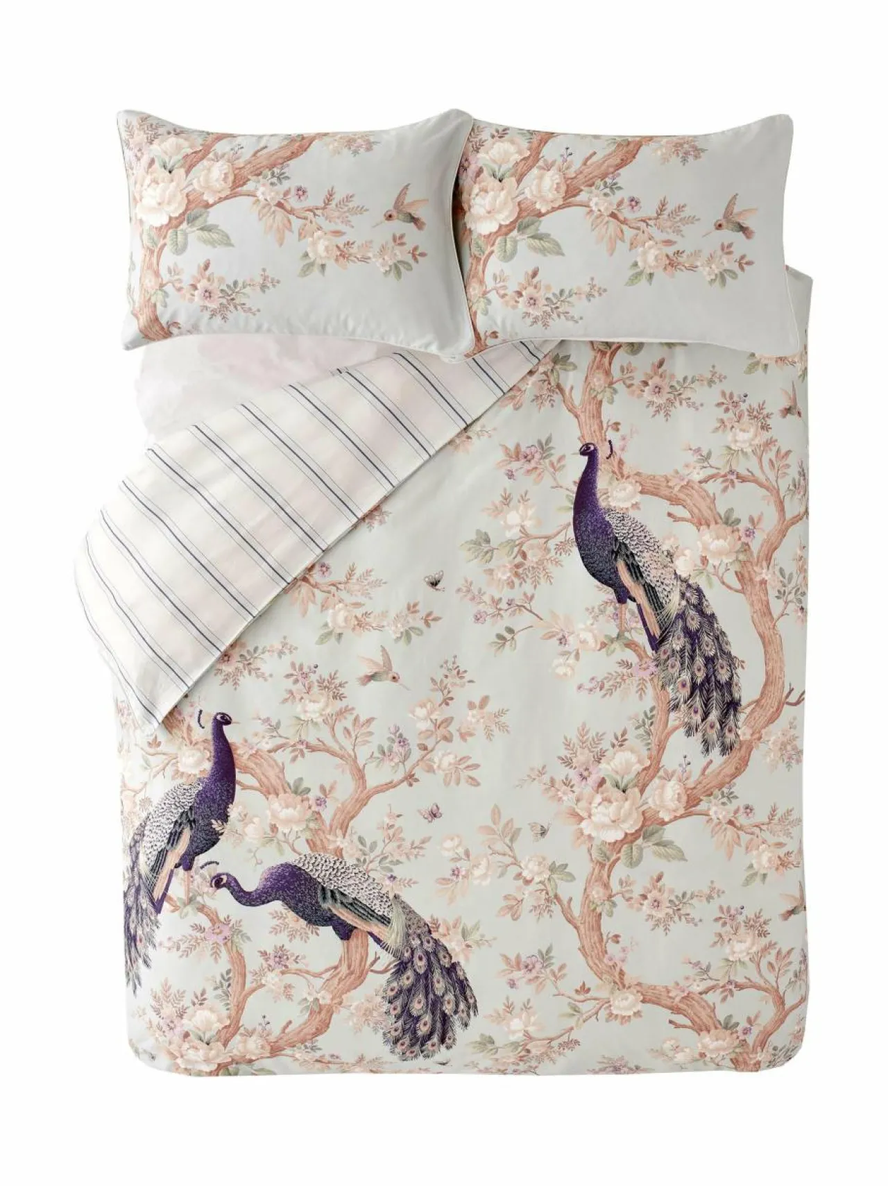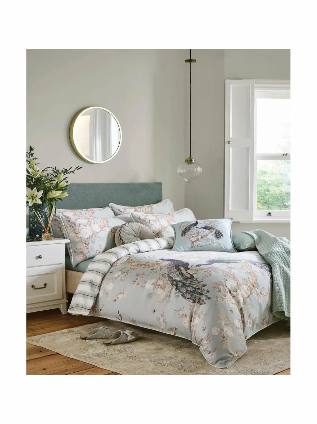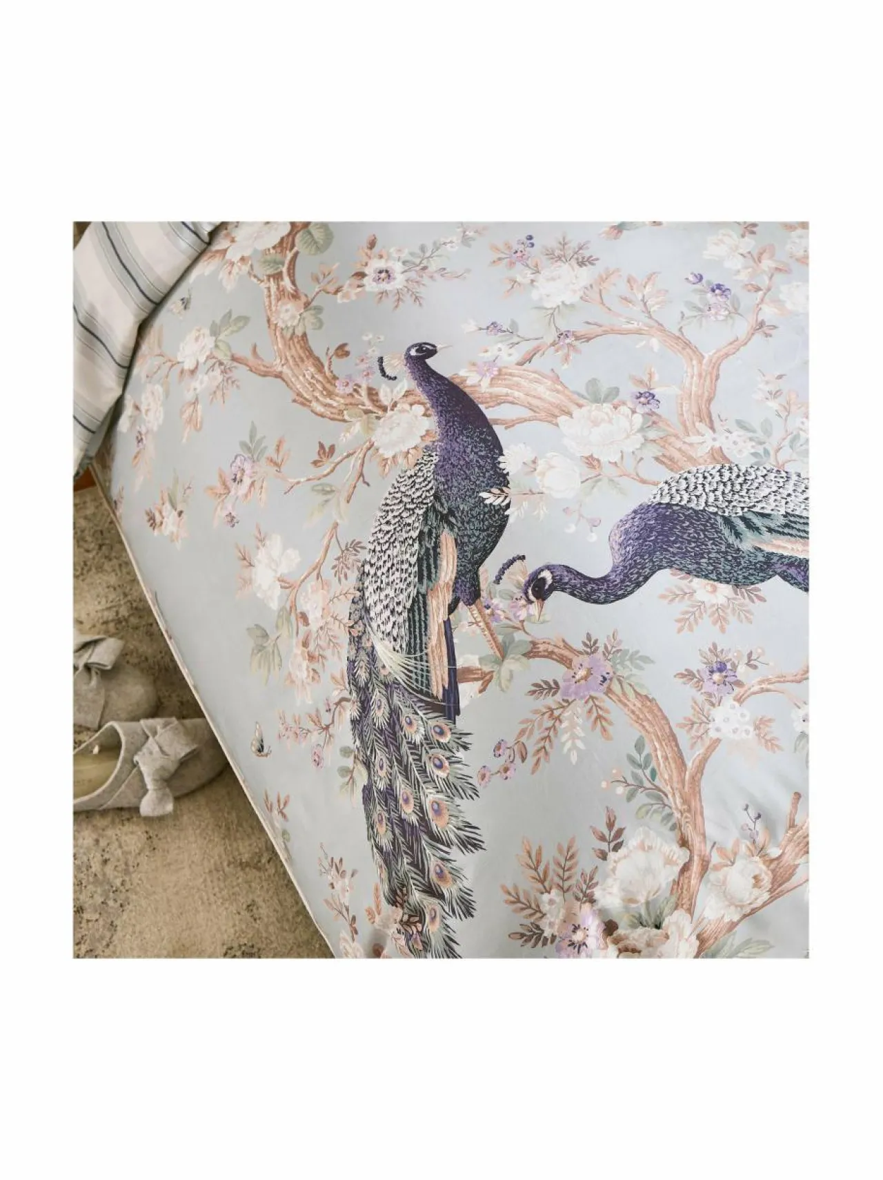 Elegantit riikinkukot ja kauniit kukat somistavat Laura Ashleyn Belvedere-pussilakanaa. Ylellisen pussilakanan molemmat puolet ovat erilaisia, joten voit aina valita mieleisesi kuosin.