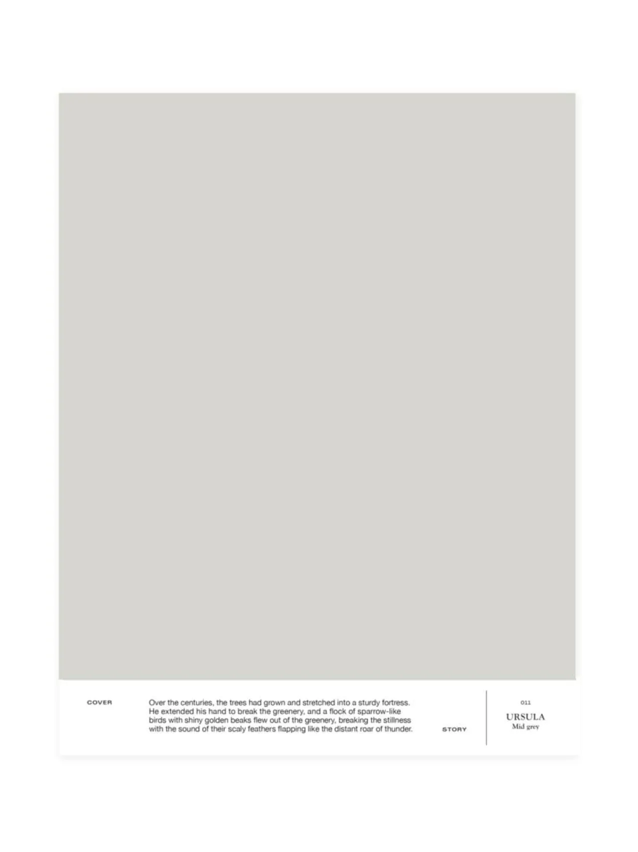 011 URSULA on hyvin klassinen ja neutraali vaaleanharmaa sävy, joka ihastuttaa erityisesti puunsävyjen rinnalla. A4-kokoinen ja tarrataustainen värimalli on maalattu aidolla täyshimmeällä Cover Story -maalilla, joten voit olla varma, että sävy on sama kuin varsinaisessa maalissa. Mallitarran voi liimata helposti suoraan maalattavalle pinnalle ja katsoa, miltä sävy näyttää erilaisissa valaistuksissa, sillä valon laatu ja määrä vaikuttavat merkittävästi siihen, miten havaitsemme värin.