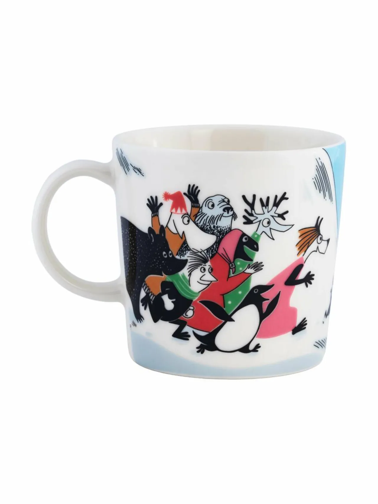 Moomin Arabia Mäkihyppy-muki 0,3 l on valmistettu lasitetusta posliinista. Muki sopii erinomaisesti aamiaiselle tai välipalalle.Muumien seikkailut talviurheilun parissa jatkuvat, kun Muumipeikko päättää osallistua mäkihyppykilpailuun tehdäkseen vaikutuksen Niiskuneitiin. Kun Niiskuneiti ymmärtää lajin vaarallisuuden, hän yrittää estää Muumipeikkoa – mutta liian myöhään. Muumipeikon ilmalento on vaikuttava, mutta se päättyy puiden oksille.