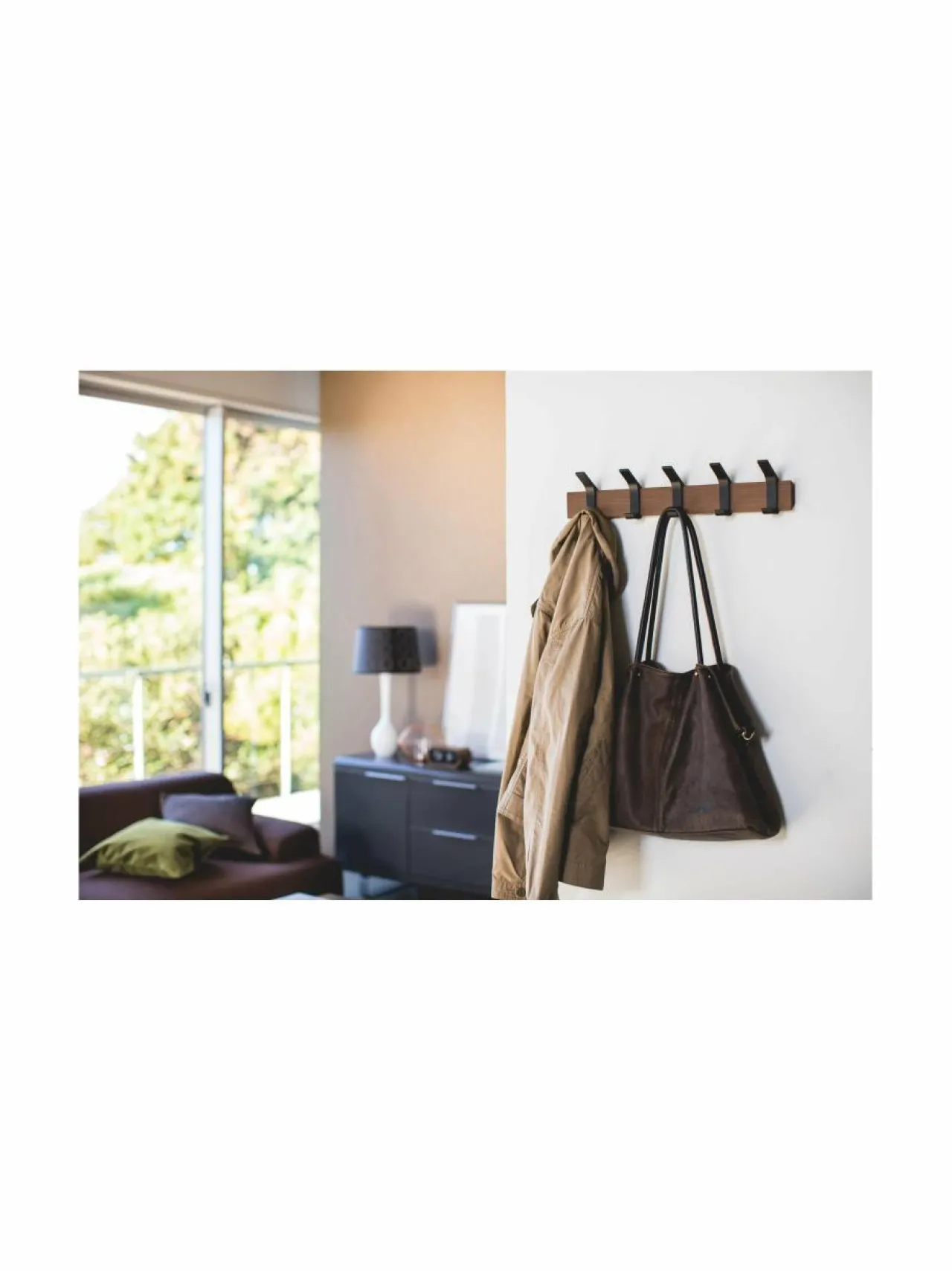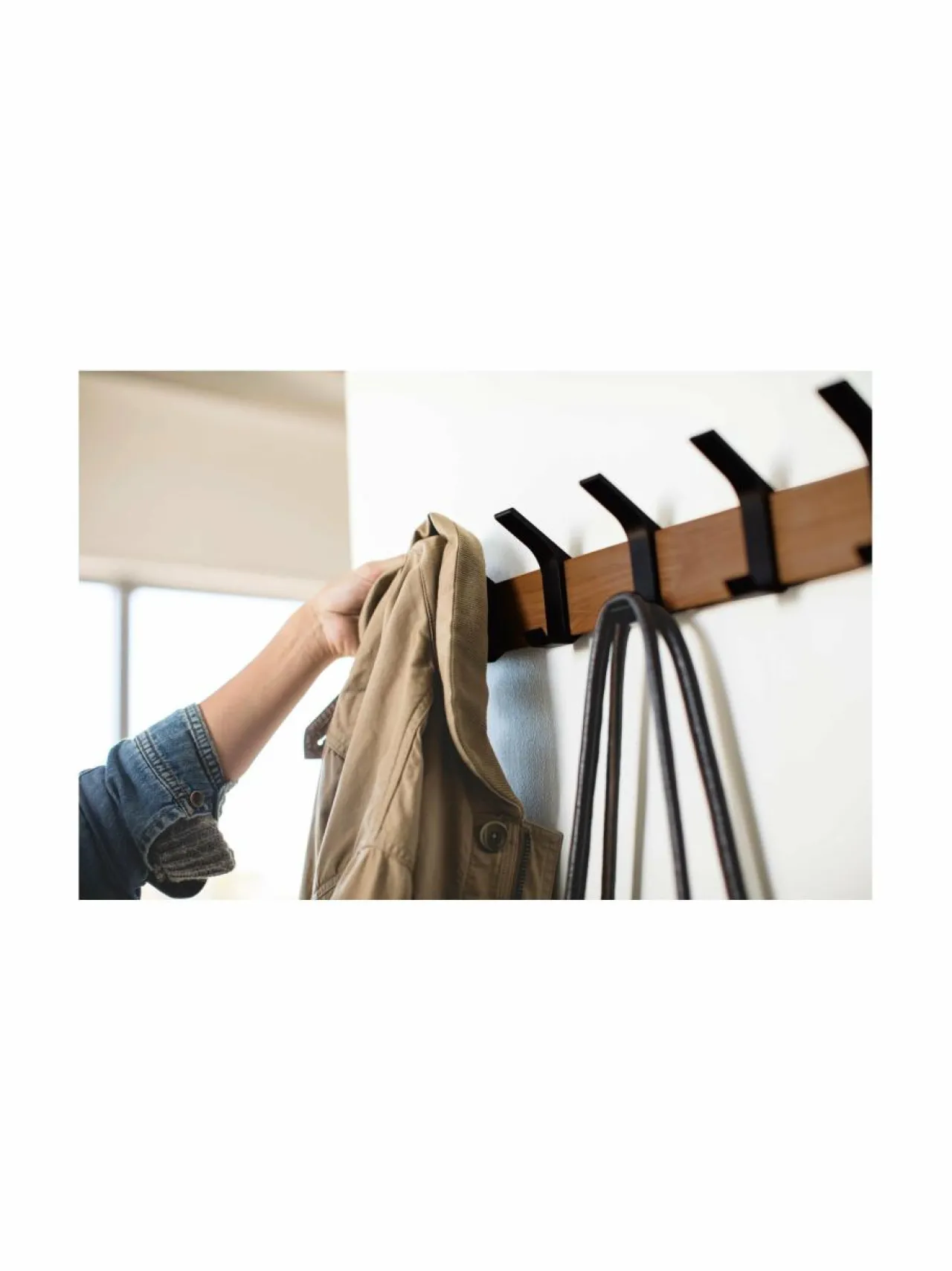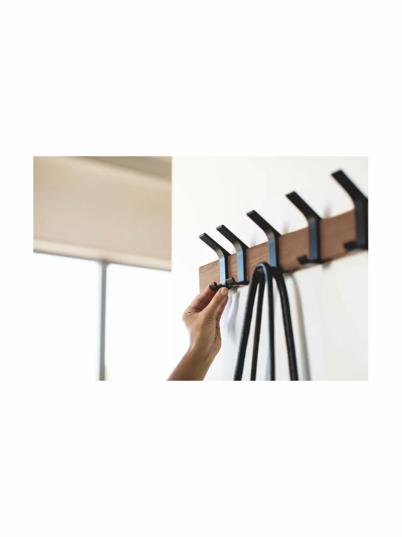Yamazakin Rin-sarjan seinään kiinnitettävässä naulakossa on kaunis pähkinäpuinen tausta. Tuotteen erikoisuus on liikuteltavat ja irrotettavat mustaksi maalatut alumiinikoukut, joiden ansiosta naulakosta voi tehdä juuri omiin säilytystarpeisiin sopivan. Leveys 50 cm. Suunniteltu Japanissa.