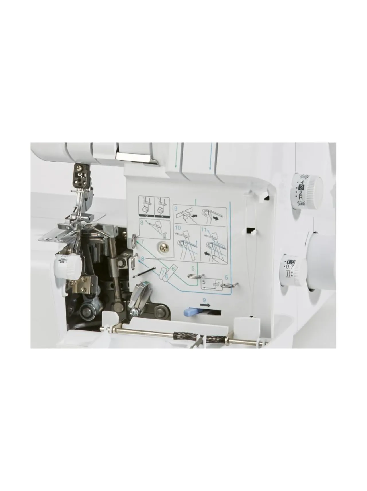 Vapaavarren avulla hihansuuresoreiden kiinnitys sujuu helposti. Saumuria voi käyttää sekä 3- että 4-lankaisena. Langoitus on helppoa, sillä värisymbolit opastavat neula- ja siepparilankojen pujotuksessa. Alasiepparin voi kääntää esiin langoituksen ajaksi. Rullapäärmevalinta on koneessa kiinteänä, joten mm. helmojen upeat kiertopäärmeet valmistuvat helposti ja nopeasti. Saumurissa on helposti ja nopeasti vaihdettavat paininjalat eri ompelutoiminnoille.