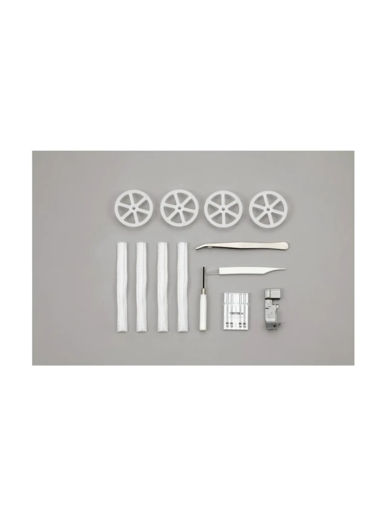 – Kotiompelukoneen neula (130/705H), kummallekin neulalle oma kiinnitysruuvi