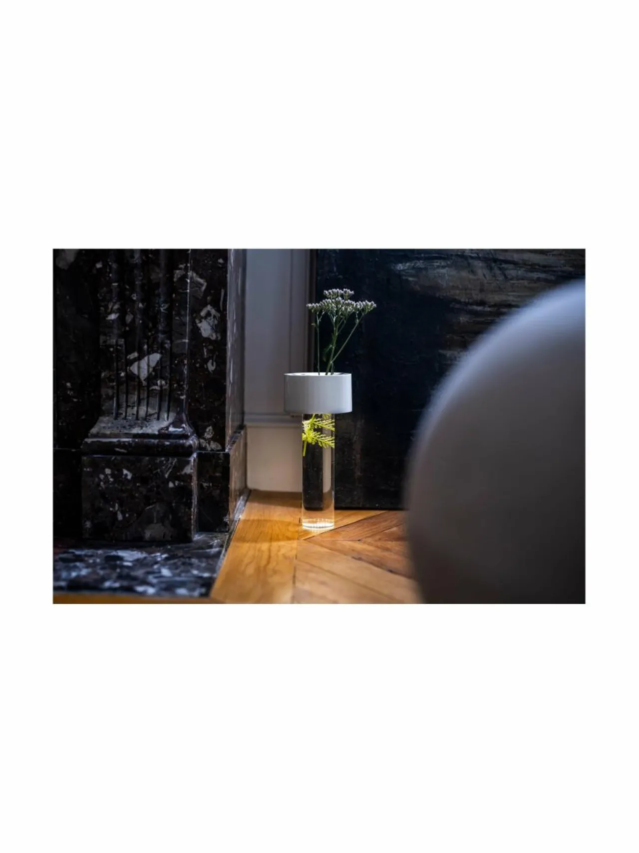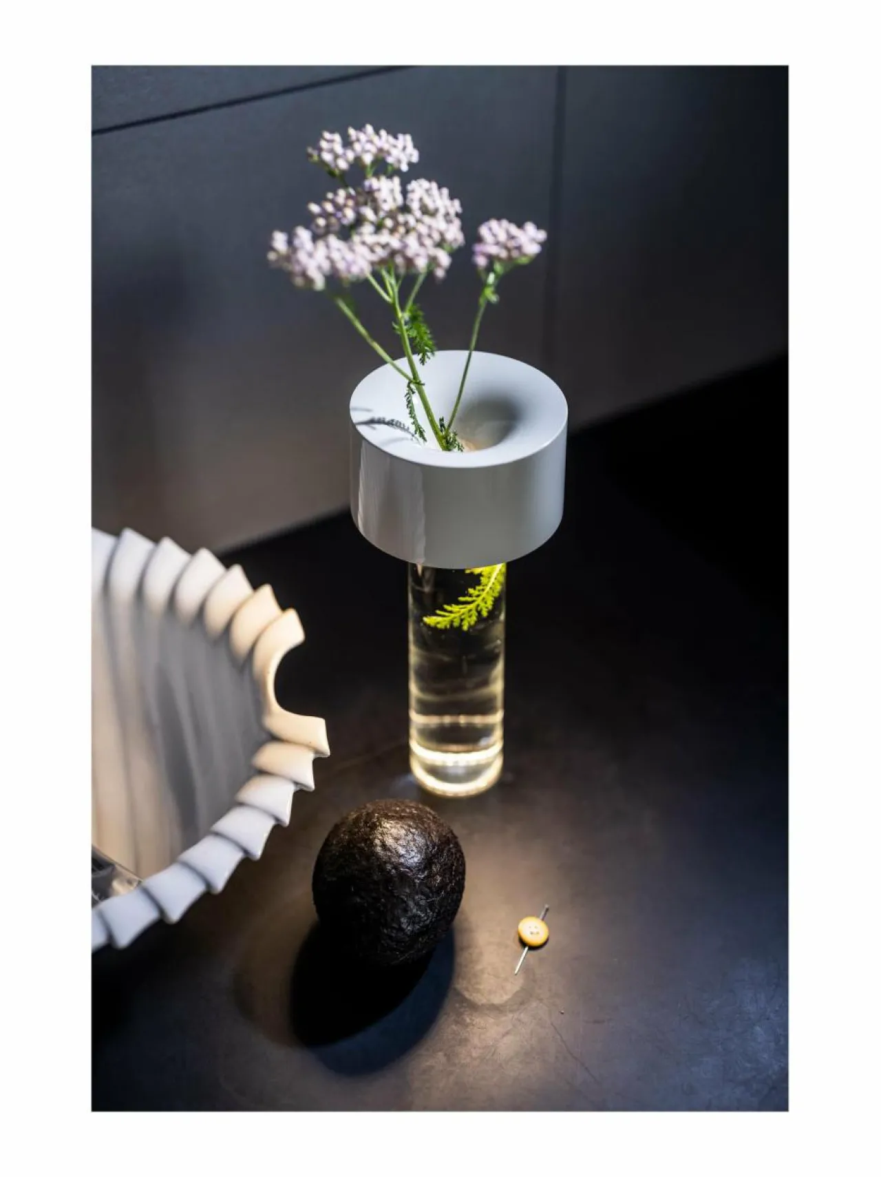 Foscarinin Fleur LED-ladattava monikäyttöinen pöytävalaisin, jossa on valonlähde ja maljakko yhdessä. Fleur on uusi johdoton pöytävalaisin, jonka Rodolfo Dordoni on suunnitellut Foscarinille. Suunnittelussa on kiinnitetty huomiota mittasuhteisiin läpinäkyvän kannattimen ja voimakkaan läsnäolon omaavan diffuusorin yhdistelmässä. Jalusta koostuu Pyrex-sylinteristä, joka on ylhäältä avoin ja jossa voi säilyttää vettä ja kukkia. Kun valaisin on päällä, valo korostaa lasisen varren profiilia. Varustettu kosketushimmentimellä. Mukana tulee USB-C-kaapeli, laturi ei sisälly hintaan. Pienikokoinen valaisin on saatavilla eri väreissä valoa säteilevään osaan, neutraaleista hienoa kiinalaista posliinia muistuttavista posliinisävyistä eloisampiin väreihin.