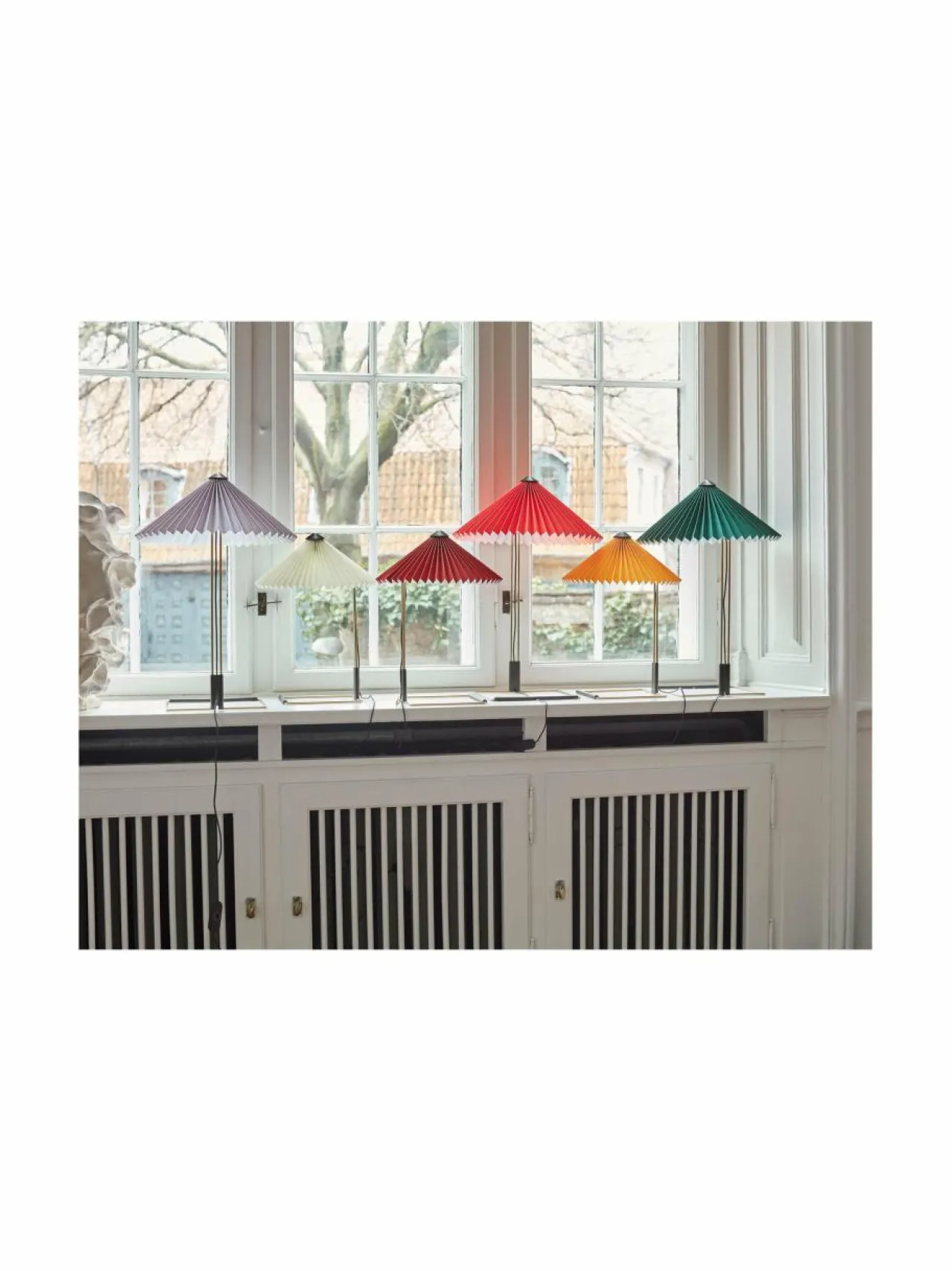 Hay Matin -pöytavalaisimessa on modernia, poeettista muotokieltä, jossa visuaalinen herkkyys yhdistyy fyysiseen jykevyyteen. Lamppu muotoutuu teräslangasta taivutetusta rungosta, joka on viimeistelty kiiltävällä messingillä ja mattamustilla yksityskohdilla. Runkoon on yhdistetty pliseeratusta puuvillakankaasta valmistettu lampunvarjostin. Valonlähteenä toimii kiinteä LED-lamppu, joka tarjoaa pehmeää, alaspäin suuntautuvaa valoa. Himmentimen avulla säädät valon määrää.