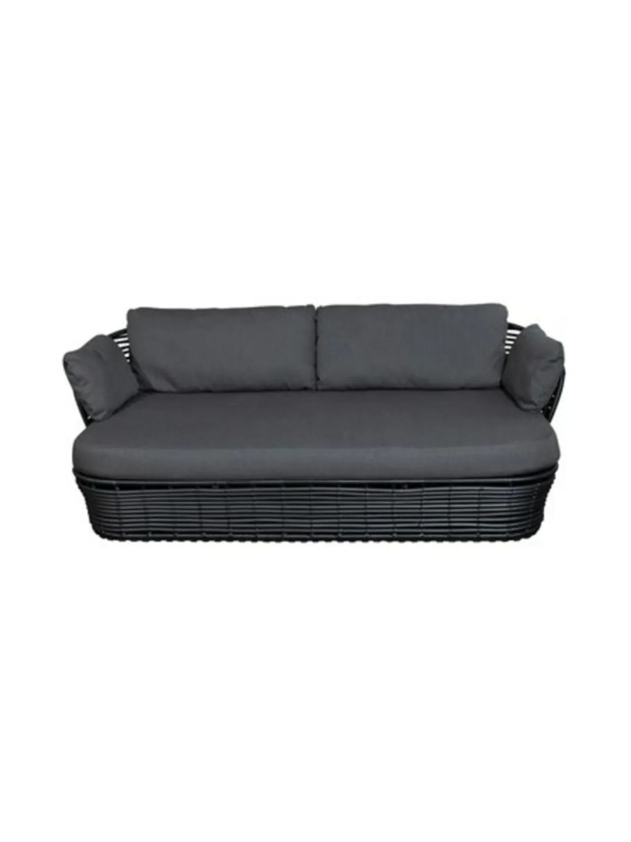 Basket -kahden istuttava sohva ulkokäyttöön. 201 cm lev, 100 syv, 70 kork, 40 istuinkork. Muhkea ja mukava Cane-Line Air Touch harmaa tyynysetti sisältyy hintaan. Grafiitin värinen Cane-line Weave® -punosmateriaali, pulverimaalattu teräsrunko.