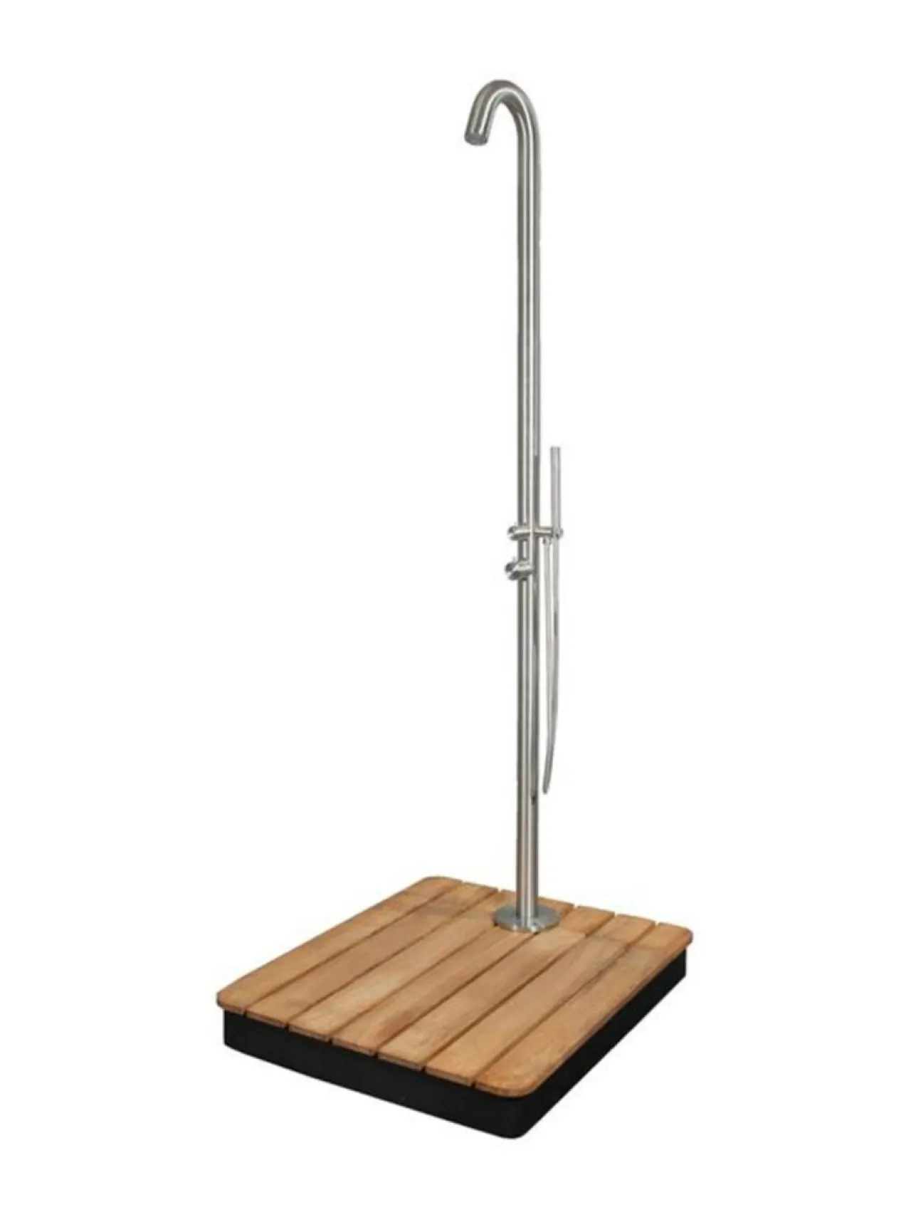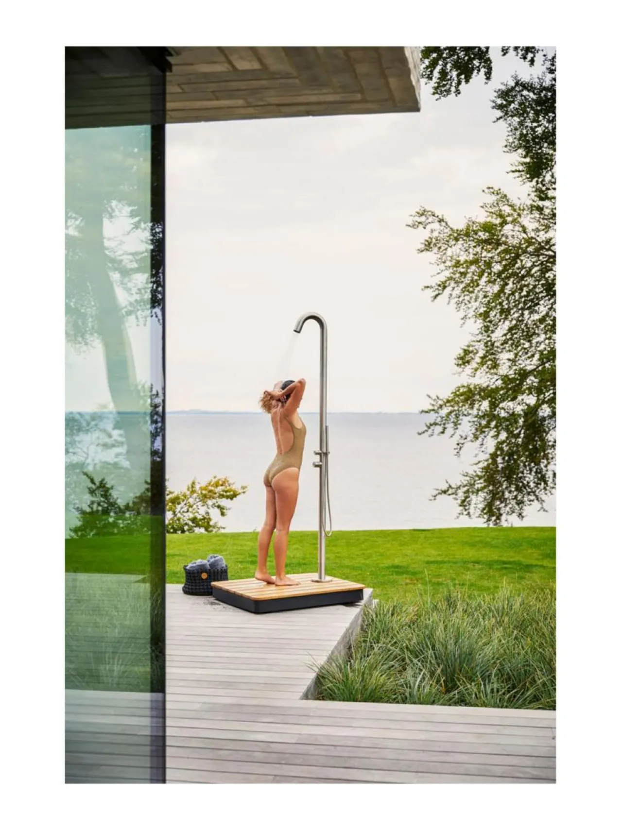 Moderni ja pelkistetty Lagoon-ulkosuihku ulkokäyttöön. Suihkuosa ruostumatonta terästä, 229 cm kork, 6 cm halk. Alusta 102,5 cm lev, 85 cm syv, 13,5 cm kork, tiikkiä.
