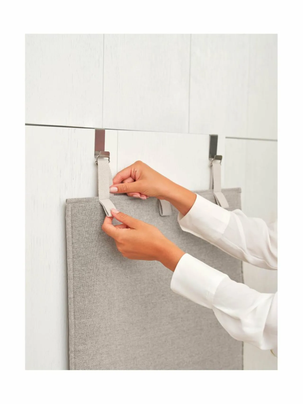 - Kiinnitys sisäoveen tai vaatekaapin oveen, ripusttuskoukkujen avulla.