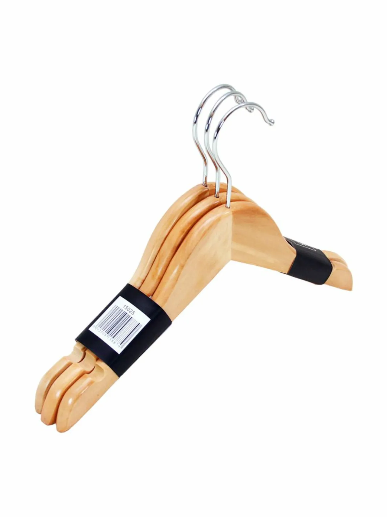 Pakkauksessa on kolme perinteisen mallista, kestävää vaateripustinta. Materiaali on lakattua vaahteraa, koukku on metallia.