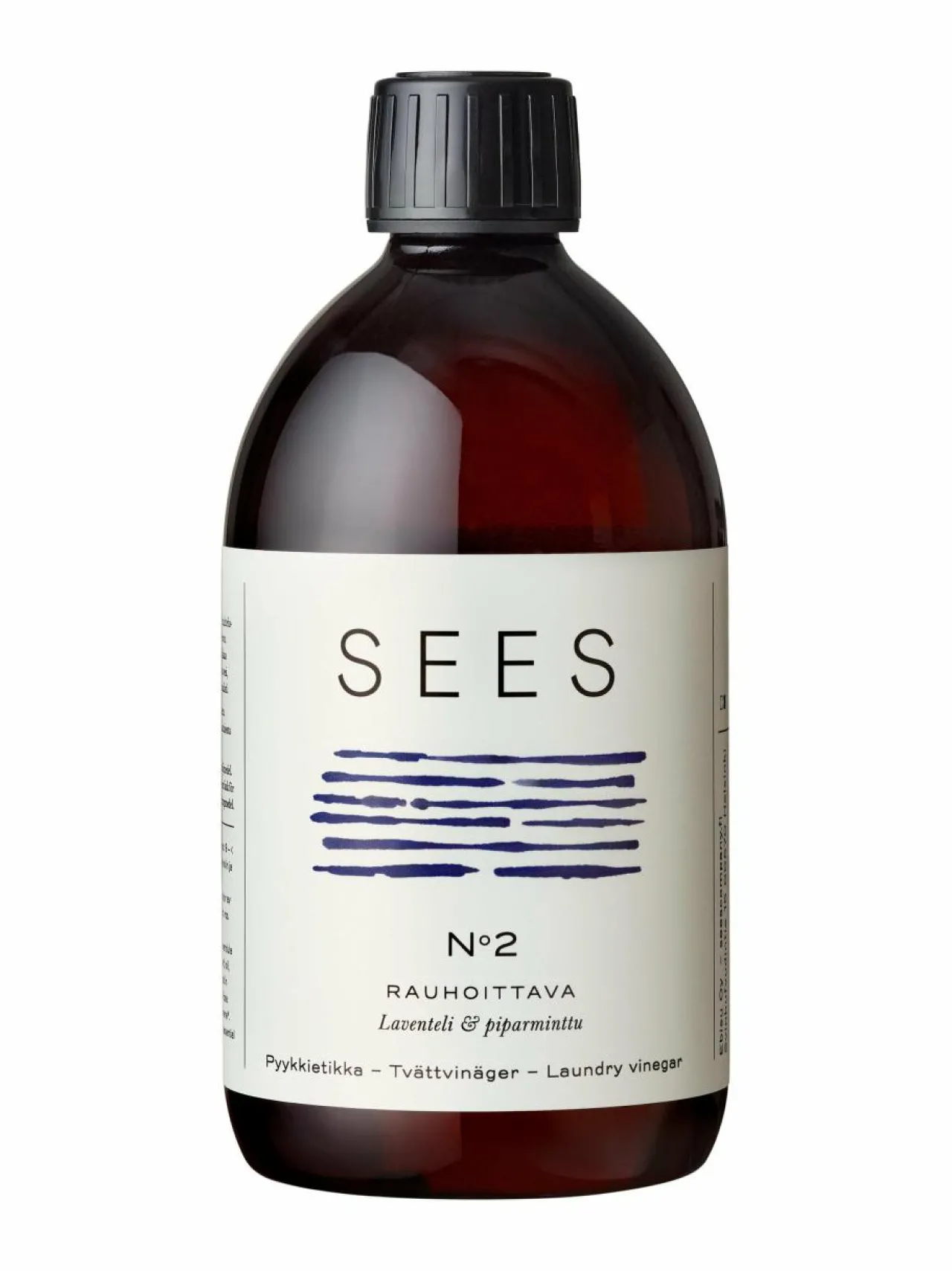 Sees pyykkietikka on korkealaatuinen, luonnollisista raaka-aineista valmistettu huuhteluaine kirjo- ja valkopyykille. Pohja-aineena toimii suomalainen väkiviinaetikka, johon ei ole lisätty vettä. Tästä syystä annosteluksi riittää vain 2-3 korkillista pyykkietikkaa.Biohajoava pyykkietikka on luonnollinen vaihtoehto korvaamaan keinotekoisen ja kemikaaleja sisältävän huuhteluaineen. Pyykkietikka ei tuki tekstiilien kuituja, jolloin esimerkiksi pyyhkeiden imukyky säilyy.Etikan tuoksu haihtuu tekstiilin kuivuessa ja jäljelle jää vain puhdas ja mieto eteeristen öljyjen tuoksu. Sees pyykkietikat kuormittavat vähemmän luontoa ja ovat tietoisen kuluttajan valinta.Pyykkietikan käyttö puhdistaa pesuainejäämät pyykkikoneesta ja pitää koneen puhtaana ja raikkaan tuoksuisena.