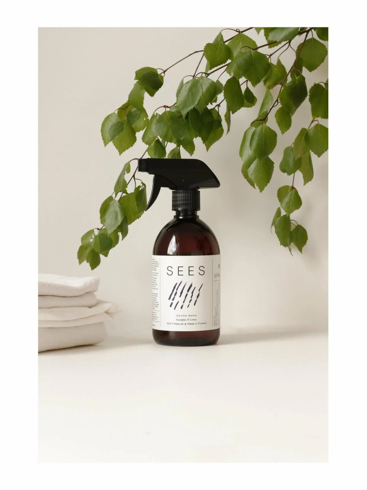 Biohajoava Sees Saunapesu on helppo tapa pestä koti- tai mökkisauna – ja samalla suihkuhuoneen kaakelit ja lasiovet. Spray-pullo tekee pesemisestä nopeampaa ja vaivatonta, eikä voimakasta jynssäämistä tarvita. Suomalaisena saunominen on lähellä sydäntä ja viihtyisän saunanillan saa aikaan puhdas ja raikkaan tuoksuinen sauna.Sooda-pohjainen saunapesu on tehokas pinttyneen lian ja hajujen poistaja. Eucalyptuksen ja sitruunan eteerisillä öljyillä tuoksutettu saunapesu on valmistettu korkealaatuisista kasviperäisistä raaka-aineista. Tuoksussa yhdistyy raikkaan sitruunan ja virkistävän eucalyptuksen eteeriset öljyt, jotka yhdessä piristävät ja raikastavat tehokkaasti koko saunan sekä tunkkaisen huoneilman. Pesun yhteydessä eteeristen öljyjen arvokkaat tuoksut vaeltavat ympäriinsä ja voit nauttia niiden aikaansaamasta aromaterapiasta.Saunapesu ei ainoastaan piristä pelkkää saunaa, vaan myös pesijän mielen. Suomessa valmistettu saunanpesuaine kuormittaa vähemmän luontoa ja on 100 % luontoon biohajoava. Pesuaineessa ei ole käytetty keinotekoisia ainesosia tai tuoksuaineita.Saunapesuaineella peset kätevästi lauteet, penkit, seinät, lattiat, suihkutilat ja jopa saunan vadit — erinomainen valinta suomalaiseen saunaan.