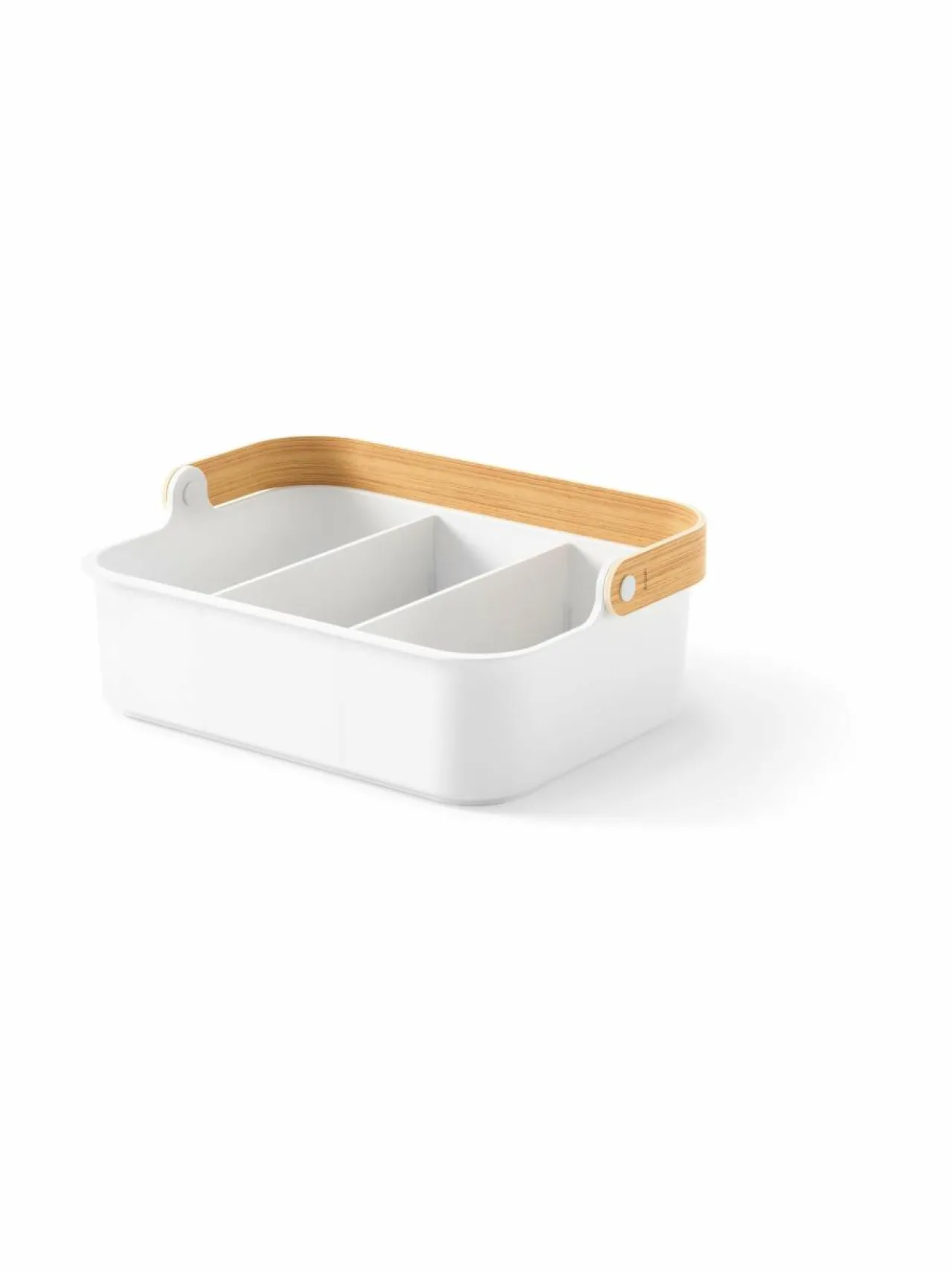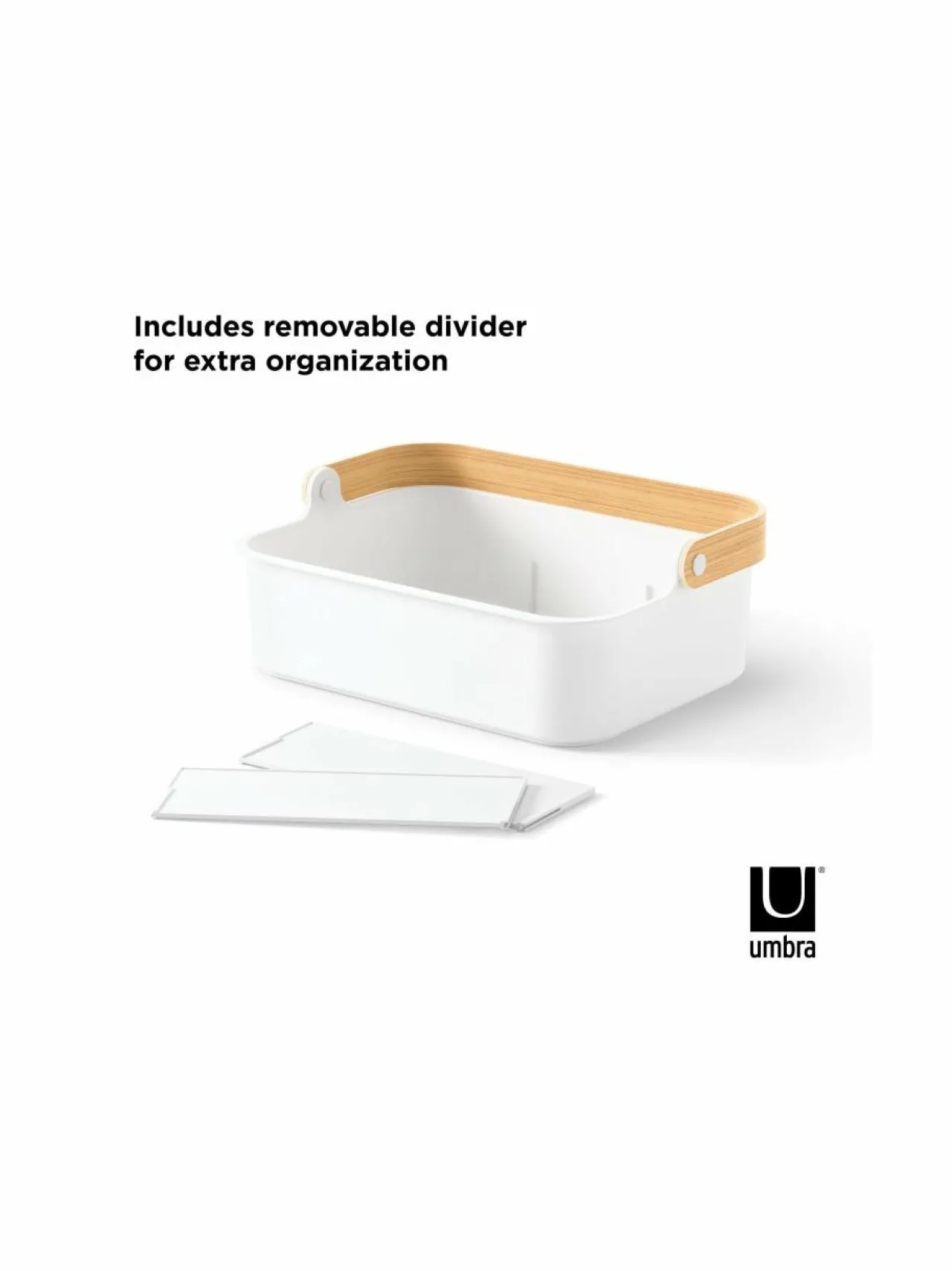 Umbran säilytyskori on pinottava ja käytännöllinen ratkaisu tavaroiden järjestelyyn. Sopii mainiosti keittiöön, kylpyhuoneeseen tai muihin kodin tiloihin. Säilytysrasiassa on kaksi irrotettavaa tilanjakajaa, joten pystyt helposti mukauttamaan sen erikokoisille tavaroille. Sen voi pinota päällekkäin ja säästää näin tilaa. Moderni ja minimalistinen muotoilu sopii monenlaiseen sisustustyyliin. Säilytysrasia kestää hyvin kosteutta, joten se on loistava ratkaisu kylpyhuoneeseen.