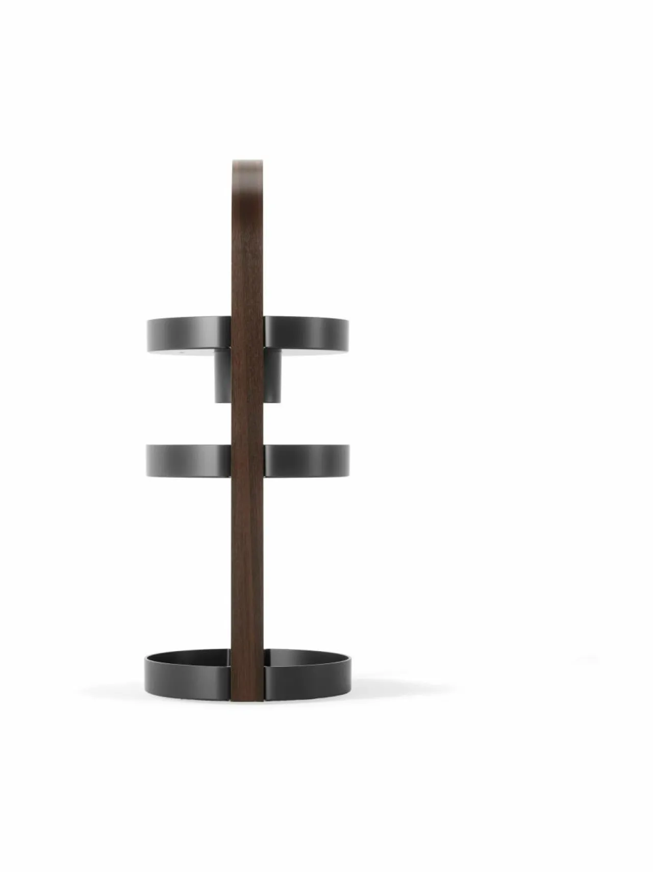 Umbran Bellwood-säilytysteline on monipuolinen ja moderni ratkaisu kosmetiikan ja muiden tuotteiden säilytykseen. Siinä on kolme tarjotinta ja puinen kahva, mikä tekee telineestä helposti siirrettävän. Irrotettava kuppi on täydellinen meikkisiveltimien ja muiden pienten kauneustyökalujen säilytykseen.
