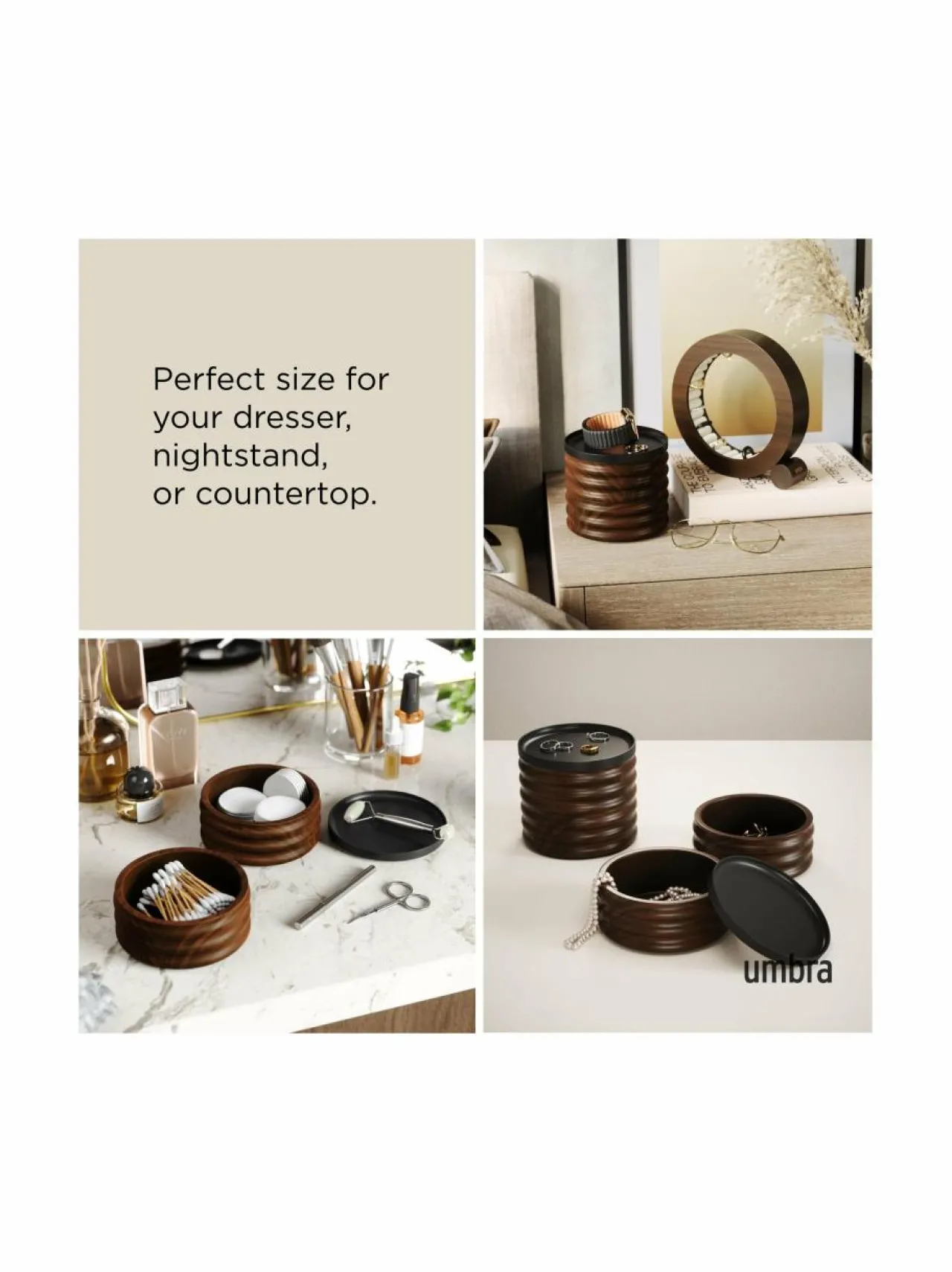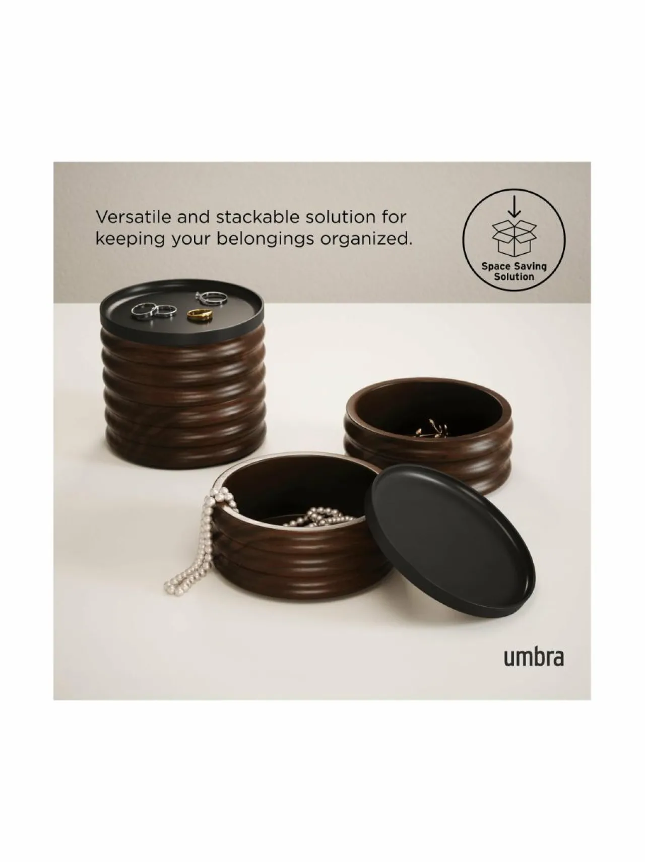 Umbran Tesora-säilytyslaatikko on moderni ja käytännöllinen ratkaisu korujen ja muiden pienesineiden säilytykseen. Laatikko on valmistettu kestävästä kumipuusta. Mukana tummansävyinen kansi. Laatikossa on kaksi pinottavaa osastoa, joihin voit säilyttää koruja, kelloja, rannekkeita ja muita pieniä esineitä.