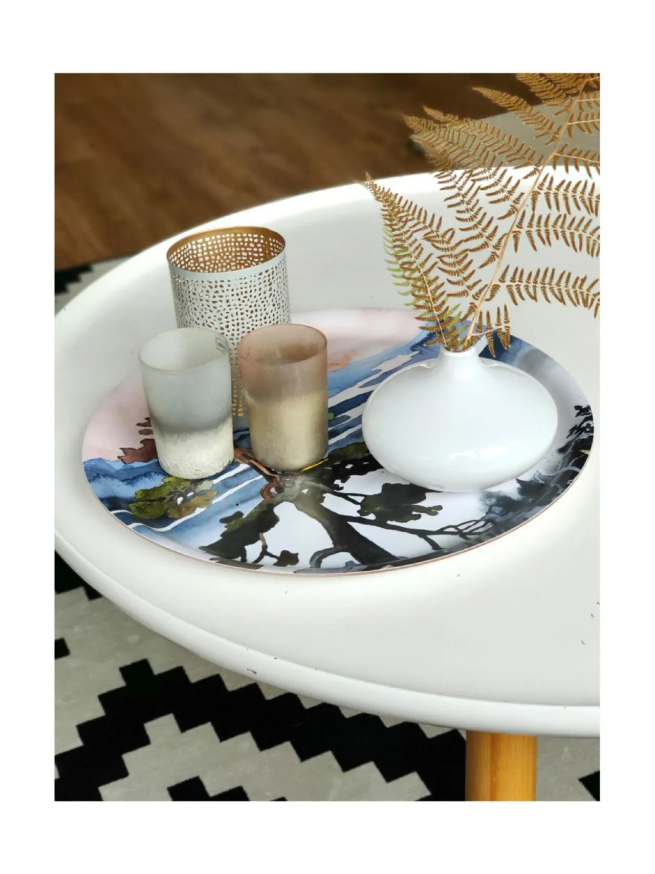 Tarjotin on monipuolinen kattauksen ja muun sisustuksen käyttötavara. Tämä pyöreä tarjotin juuri sopiva kakkujen tarjoilulautaseksi. Maalauksellinen tarjotin on ihana sisustusesine myös sohvapöydälle.