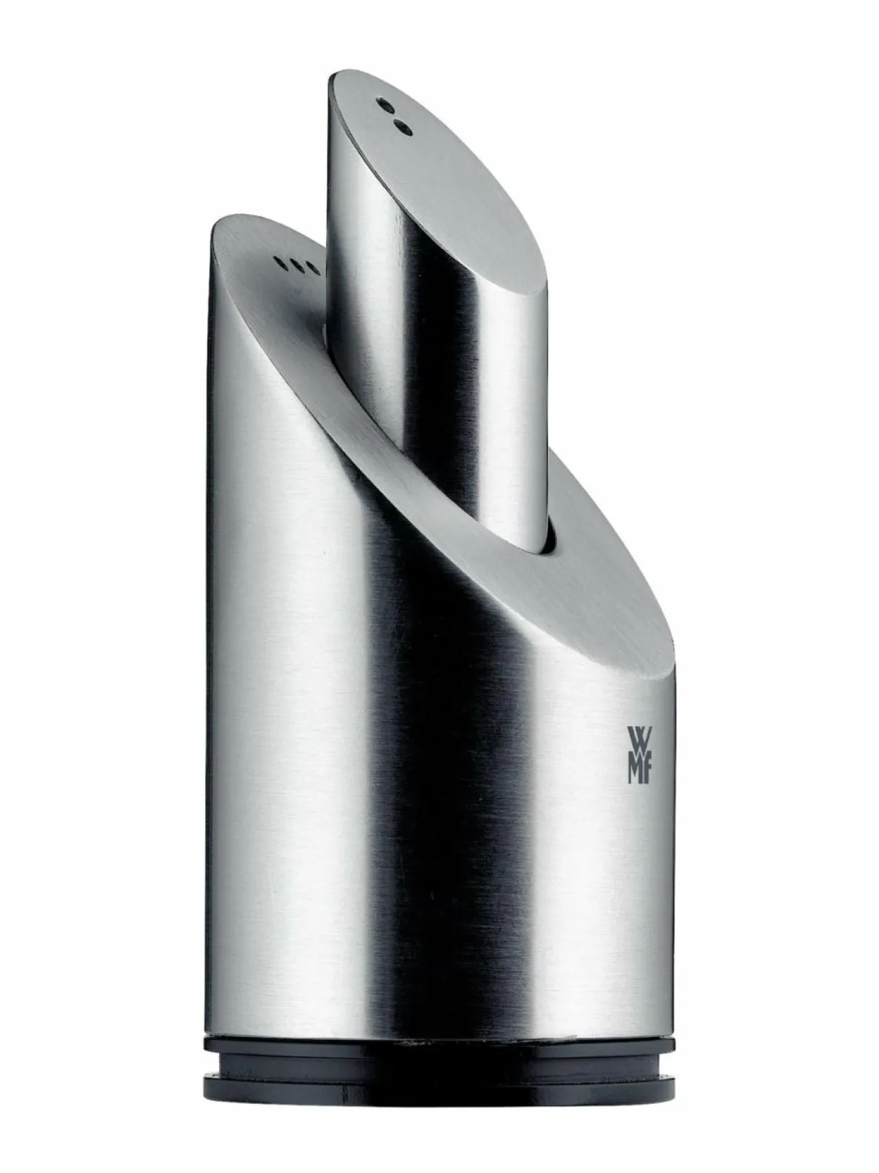 Suola- ja pippurisirottimet ovat yhdessä ja muodostavat sen vuoksi kätevästi muotoillun yhtenäisyyden. WMF:n suola- ja pippurisirottimet käsittävät eri reikäkokoja tai eri määrän reikiä, jotka on sovitettu kyseiseen sisältöön. Monia suuria reikiä suolalle ja vähemmän pieniä reikiä pippurille. Pienestä koostaan huolimatta suola- ja pippurisirottimet voidaan tarpeeksi erottaa toisistaan.Materiaali on Cromargan ruostumaton teräs 18/10 – helppo puhdistaa, ei jätä makua, haponkestävä.