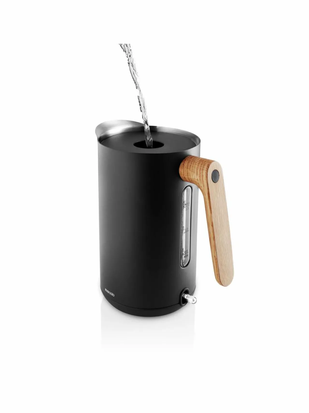 Eva Solon Nordic Kitchen -vedenkeittimessä ajaton mattamusta yhdistyy lämpimään tammeen.