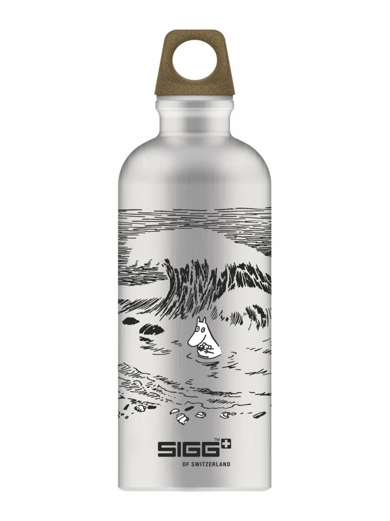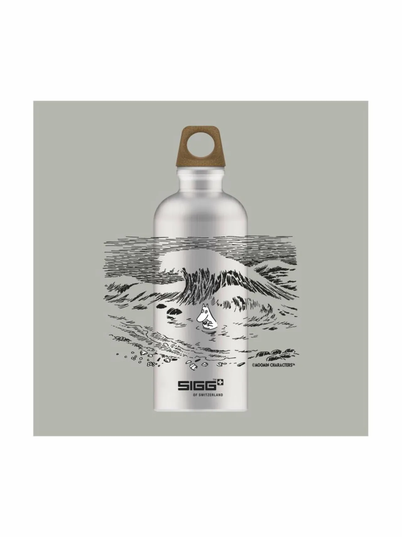 SIGG x Moomin Novels kaunis mallisto on saanut inspiraationsa kirjasta Muumipeikko ja Pyrstötähti (1946). Tässä kauniissa metallin värisessä pullossa on klassinen kuvitus Muumipeikosta merellä.