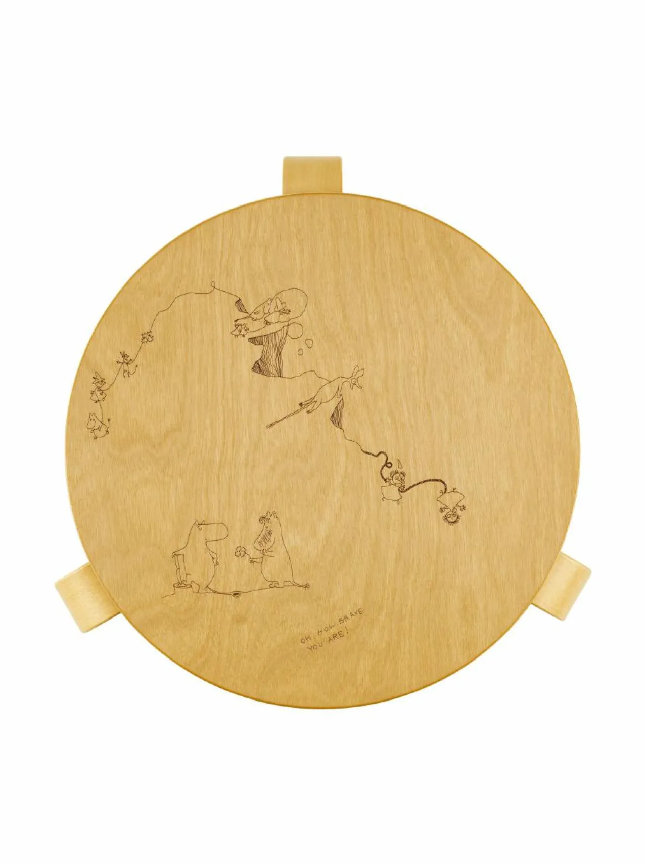 Samaan aikaan, kun Artekin perustamisesta tulee kuluneeksi 90 vuotta, on myös ensimmäisen Muumi-tarinan julkaisemisesta kulunut 80 vuotta – on siis aika juhlia. Artek + Muumit -kokoelman jakkara 60 Juhla ja kaappi 250 Juhla kertovat suomalaisesta vieraanvaraisuudesta, joka on usein parhaimmillaan silloin, kun se on improvisoitua ja epämuodollista. Artek + Muumit -kokoelman jakkara 60 Juhla takaa, että pöydässä on aina ylimääräinen paikka odottamattomalle vieraalle, joka sattuu poikkeamaan kylään. Jakkaran istuimeen ja taivutettuihin jalkoihin on laserkaiverrettu Tove Janssonin kuvituksia. Kuvitukset, joissa piirustukset yhdistyvät käsinkirjoitettuihin, Janssonin varhaisimmista muistikirjoista ja Muumi-tarinoista poimittuihin teksteihin, muistuttavat vanhan koulupöydän alle kätkettyjä salakavalia raapustuksia. Hunajapetsattu Juhla-jakkara muistuttaa sävyltään patinoitunutta vintage-jakkaraa. Jakkara 60 Juhla on saatavilla vain Artek 90 -juhlavuoden ajan. Valmistettu Suomessa.